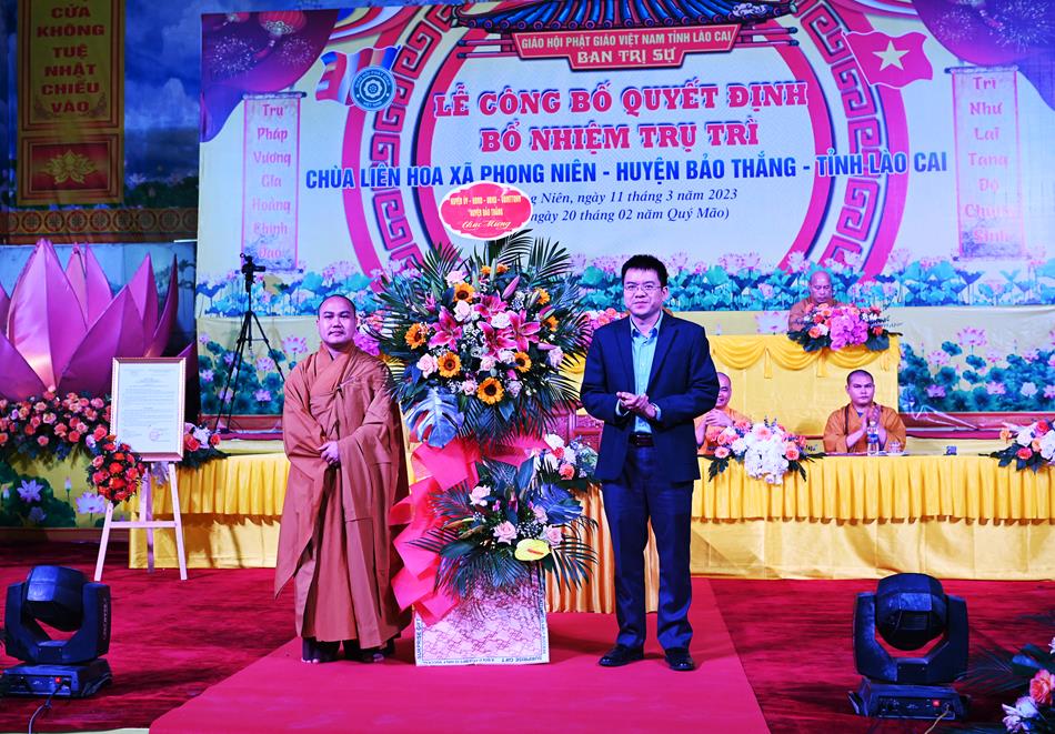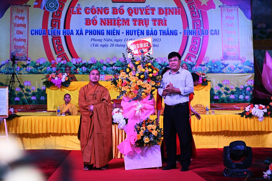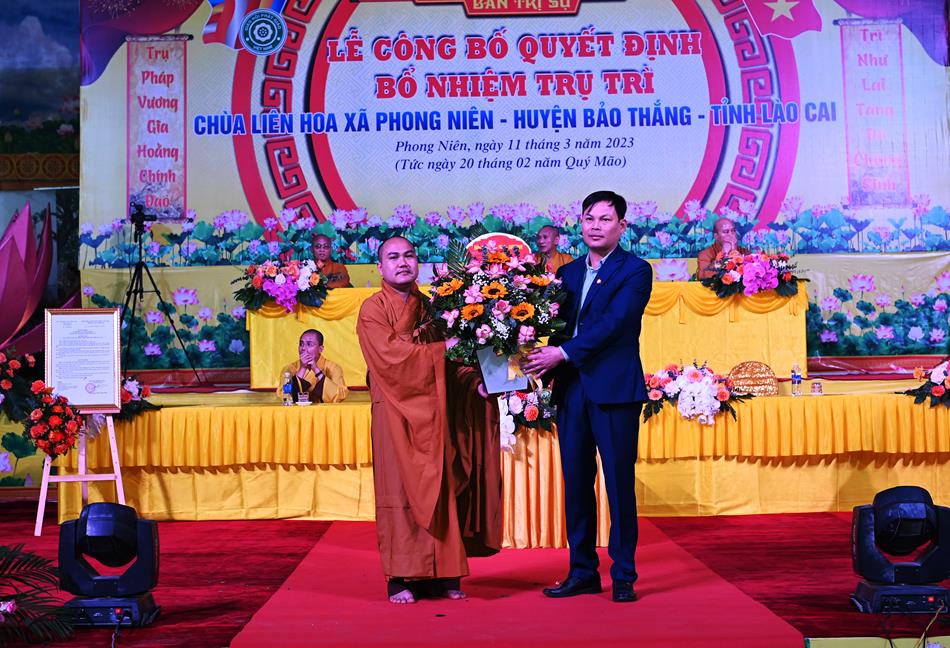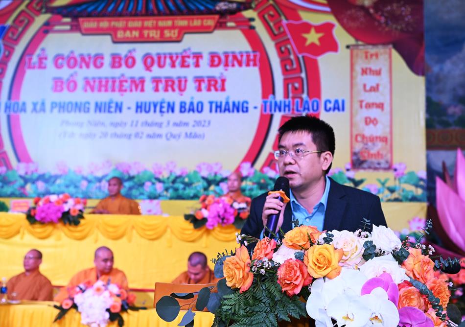 Ông Nguyễn Đức Bình, Phó chủ tịch UBND huyện Bảo Thắng thay mặt chính quyền phát biểu và tặng hoa chúc mừng.