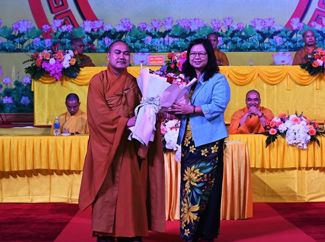 ĐĐ. Thích Chân Niệm đón nhận nhiều lẵng hoa và phần quà của chư Tôn đức, lãnh đạo chính quyền và nhân dân Phật tử trao tặng chúc mừng.
