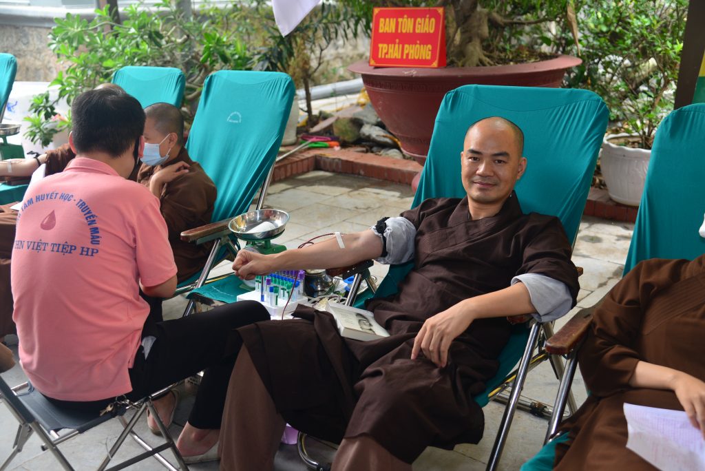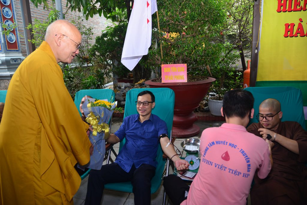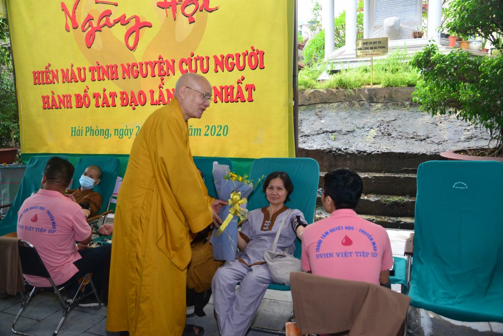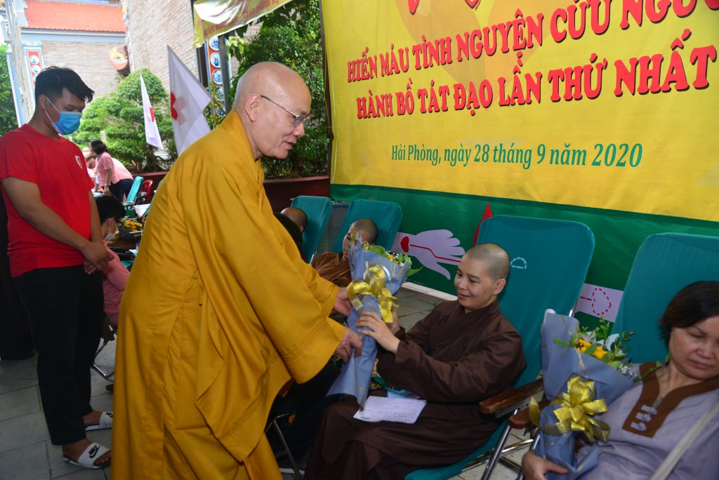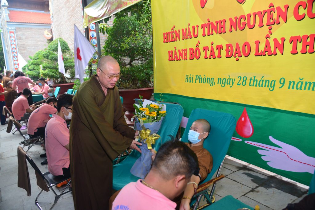 Nhân dịp này, HT. Thích Quảng Tùng - Phó chủ tịch HĐTS TƯ GHPGVN, Trưởng BTS GHPGVN TP. Hải Phòng đã chia sẻ tới chư Tôn đức Tăng Ni, các vị quan khách về “Ý nghĩa Hành Bồ Tát đạo”. Hòa thượng cho biết: Trong Phật giáo có 2 loại bố thí. Đó là bố thí Nội tài và bố thí Ngoại tài. Bố thí nội tài là những đóng góp bằng sức lực hoặc hy sinh thân mạng mình để cứu vớt người khác, hiến tặng các bộ phận khác trên cơ thể, những gì mình sẵn có; Bố thí ngoại tài là những đóp góp bằng tiền, của cải, vật chất bên ngoài và hiến máu chính là hành động bố thí nội tài tốt nhất với thông điệp “Một giọt máu cho đi, một cuộc đời ở lại”.
