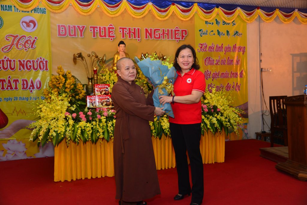 Đại diện Hội CTĐ thành phố tặng hoa tri ân Ban từ thiện - xã hội GHPGVN TP. Hải Phòng