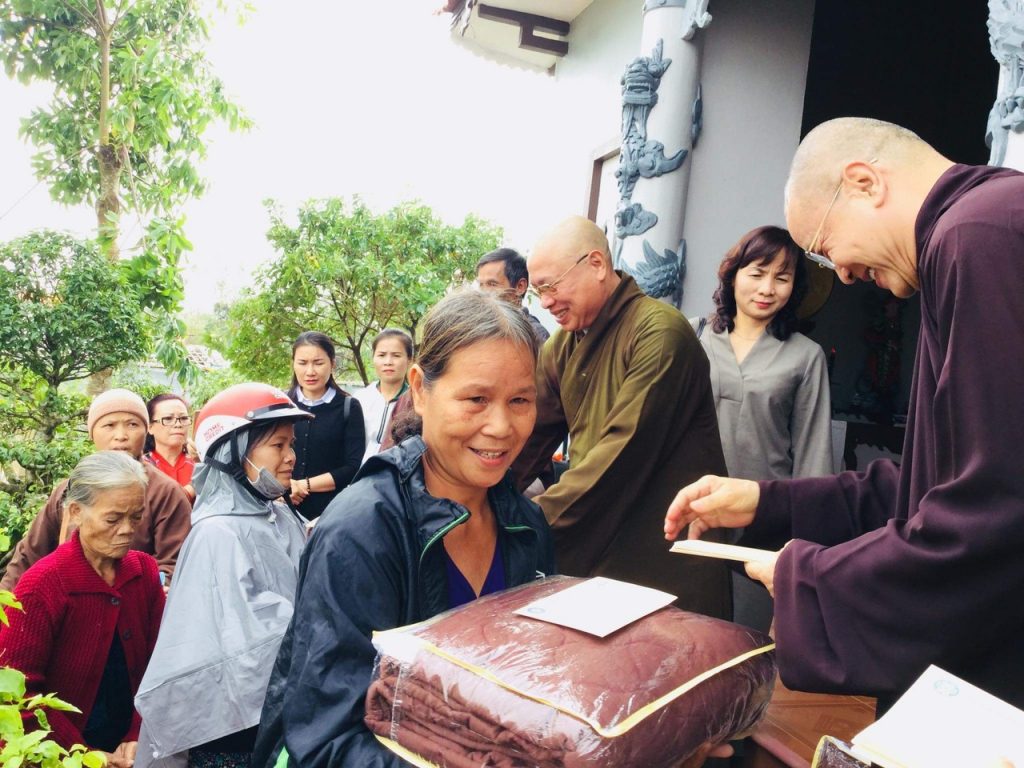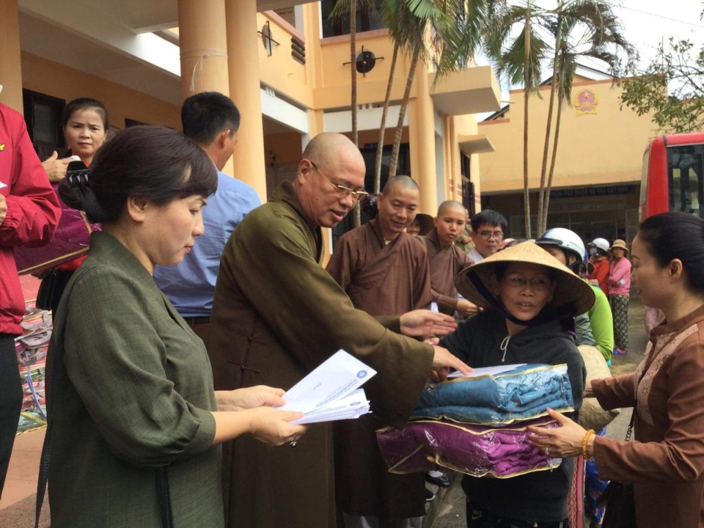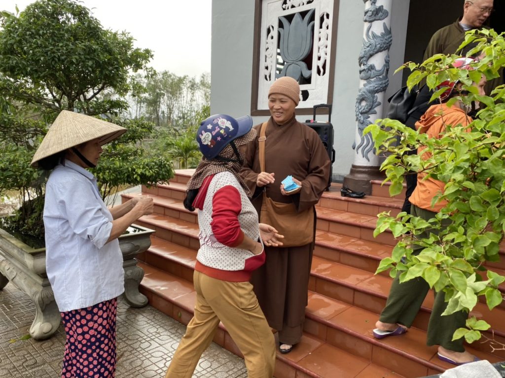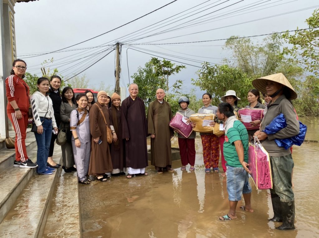 Ngày 16/11/2020 đoàn đã tới động viên, thăm hỏi và trao 250 phần quà cho 250 hộ gia đình có hoàn cảnh khó khăn bị thiệt hại do lũ lụt, sạt lở đất thuộc xã Quảng Vinh, huyện Quảng Điền, tỉnh TT-Huế. Mỗi phần quà bao gồm 1 phong bì tiền mặt 1 triệu đồng và 1 chiếc chăn ấm. Chiều cùng ngày, đoàn tới động viên, thăm hỏi, chia sẻ khó khăn, mất mát với thân nhân của một số gia đình chiến sỹ đã anh dũng hy sinh trong đợt cứu hộ, cứu nạn do sạt lở núi tại tiểu khu 67 và thuỷ điện Rào Trăng 3. Đồng thời, chư tôn đức đã làm lễ dâng hương, tưởng niệm và tụng kinh cầu nguyện hương linh các anh hùng, liệt sỹ sớm được siêu thoát.