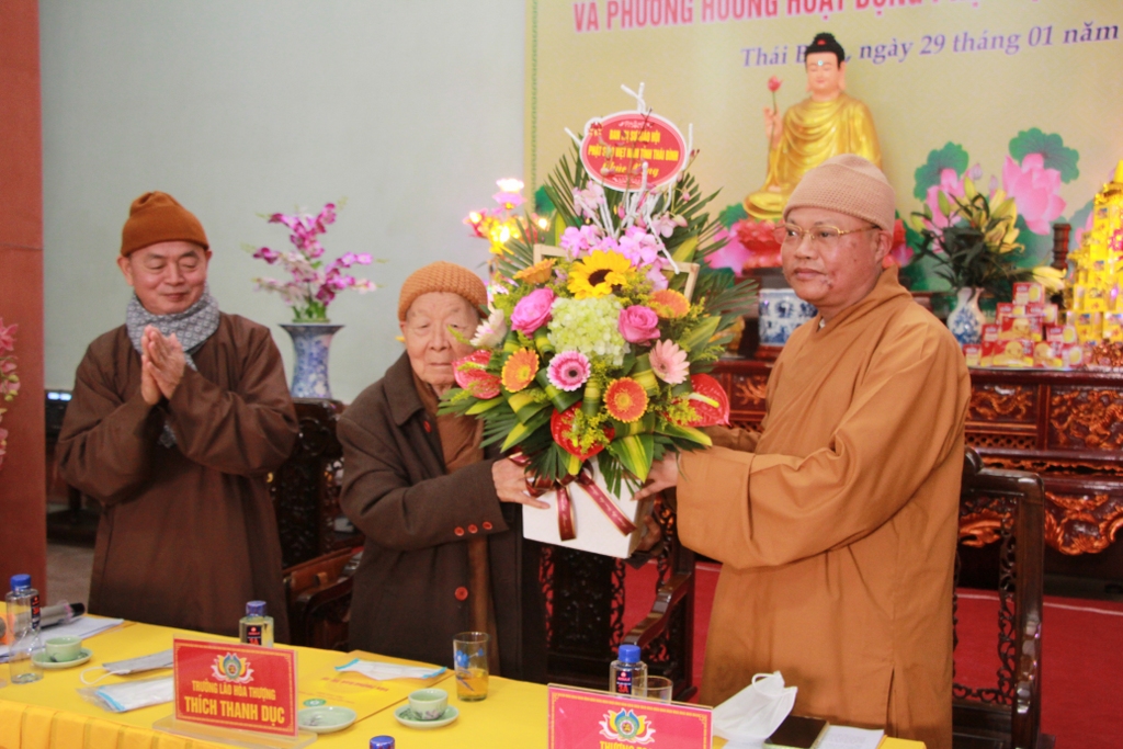 Hội nghị được lắng nghe đạo từ của Trưởng lão HT.Thích Thanh Dục tán thán công đức của BTS GHPGVN tỉnh, nhắc nhở mỗi Tăng Ni cần noi gương các bậc tiền bối, luôn “đoàn kết hòa hợp, trưởng dưỡng đạo tâm, trang nghiêm giáo hội”, tinh tấn tu hành, đưa Phật giáo Thái Bình phát triển vững mạnh.