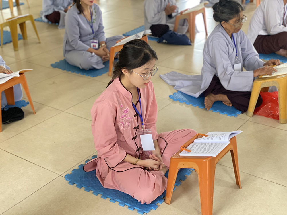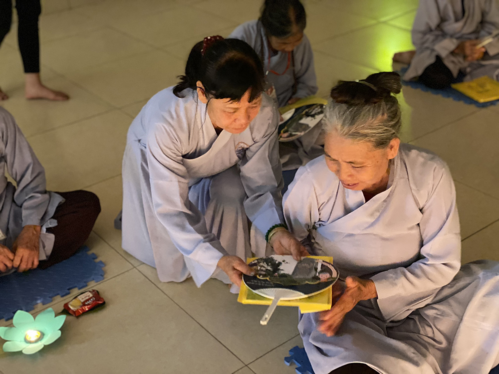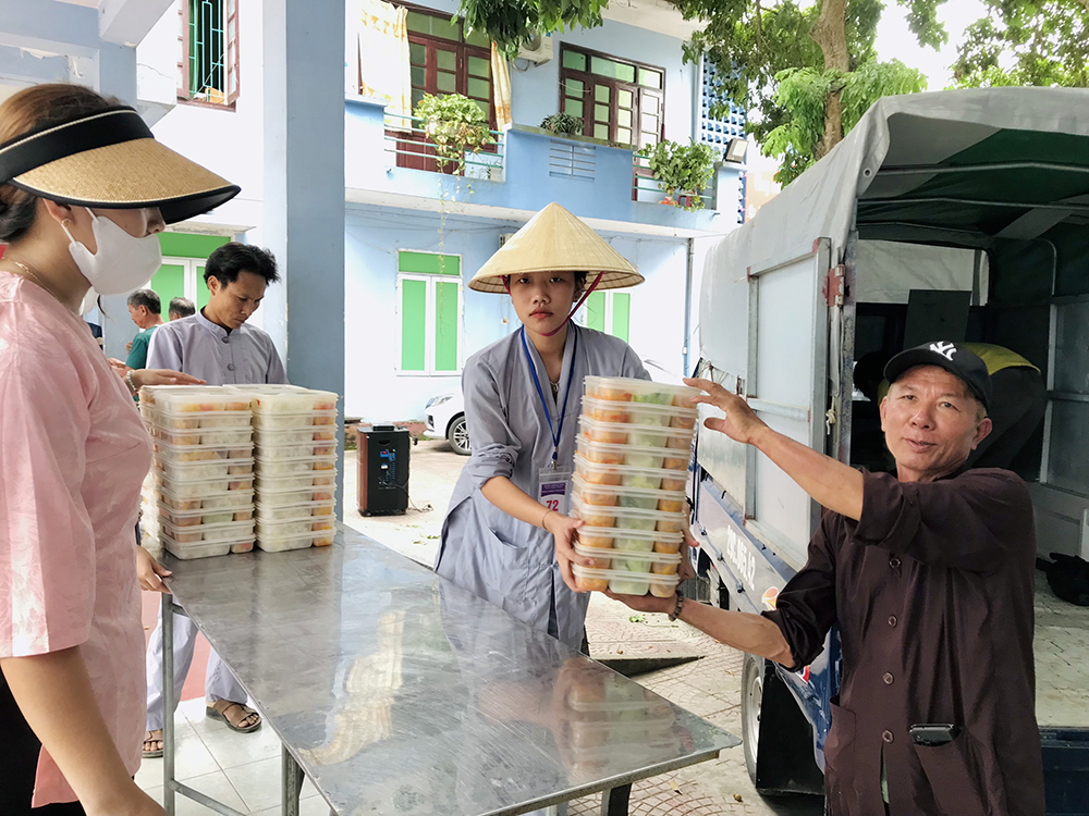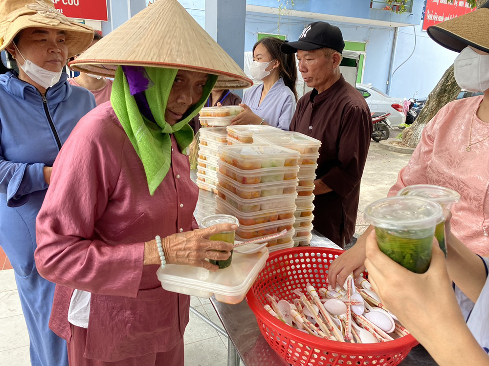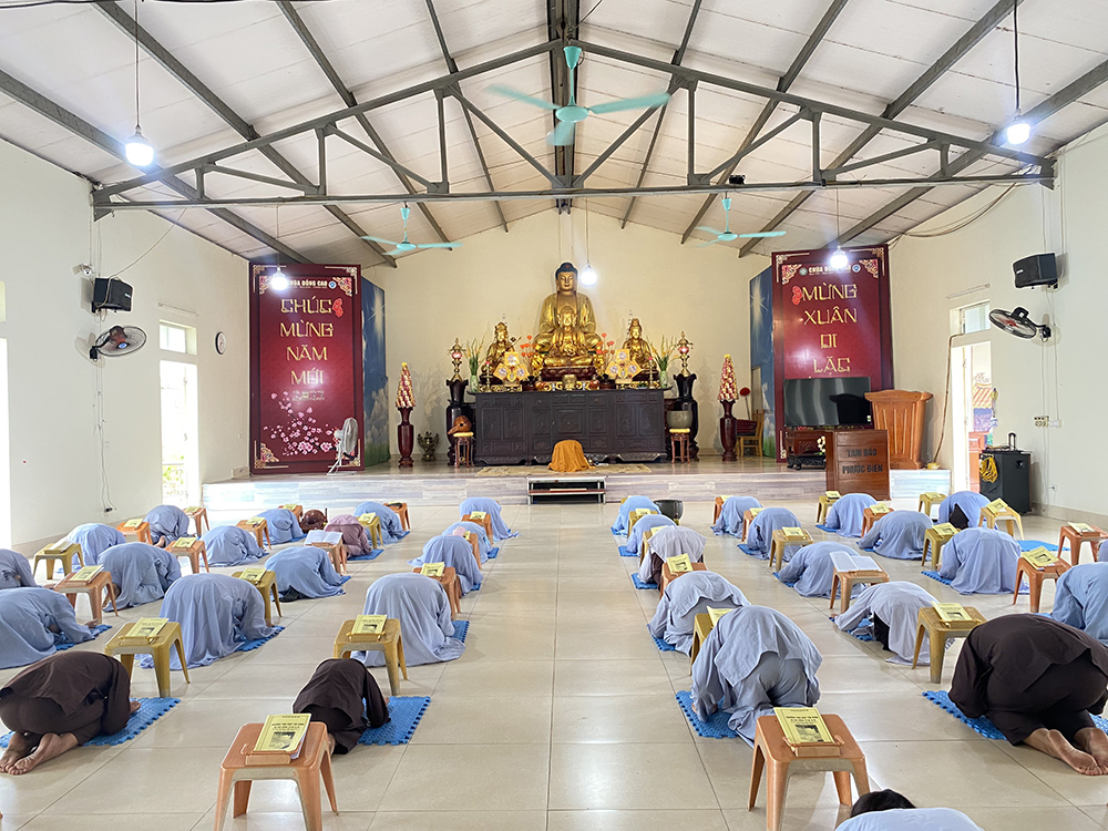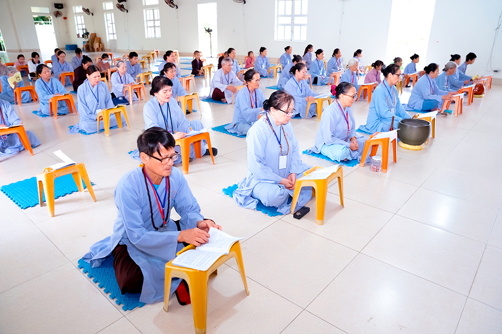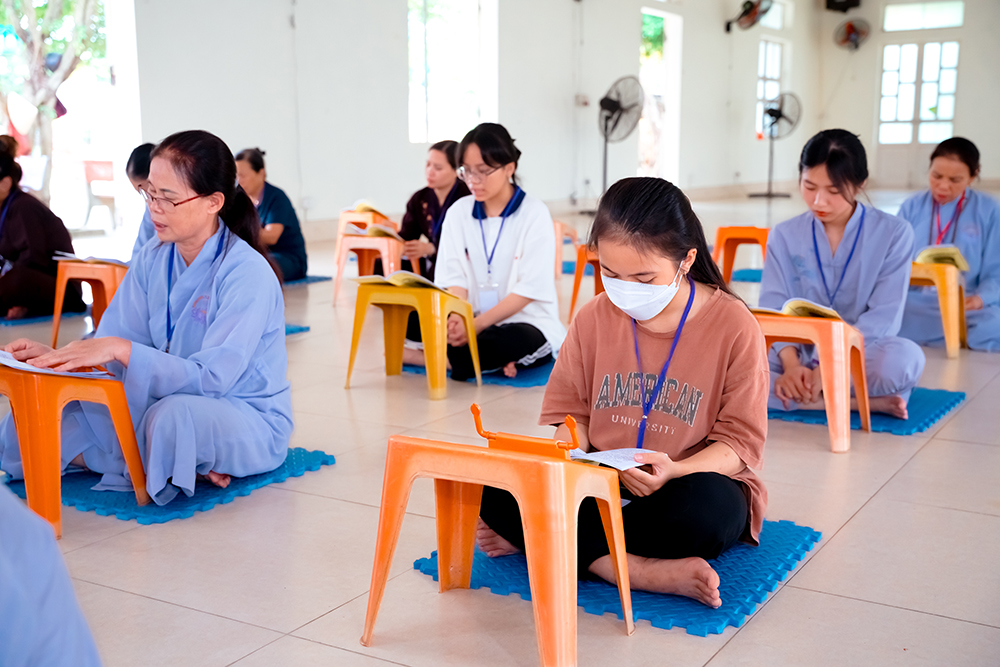 Sau khi nhận thẻ khóa tu, quý Phật tử trở về giảng đường tu tập trì tụng kinh Địa Tạng do Đại đức trụ trì hướng dẫn. Tiếp đó, nhà Chùa đã chuẩn bị những phần cơm chay phát tại Bệnh viện do Phật tử Liên Hồng hướng dẫn.