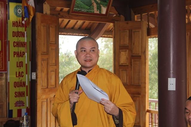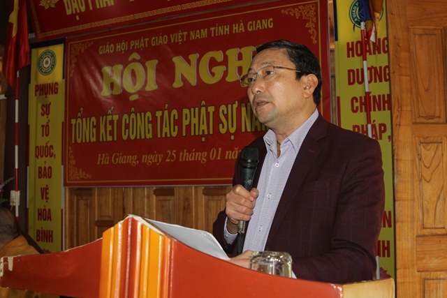 Ông Nguyễn Thành Công - Phó Giám đốc Sở Nội vụ tỉnh, đại diện chính quyền phát biểu tại Hội nghị. Ông đánh giá cao mọi hoạt động mà BTS GHPGVN tỉnh Hà Giang đã đạt được. Những thành tựu quan trọng trong thời gian qua thể hiện tinh thần đoàn kết hòa hợp, phụng sự Đạo pháp, thực hiện đúng theo đường lối chủ trương của Đảng và Nhà nước của Tăng Ni và Phật tử trong Tỉnh. Ông mong muốn Tăng Ni, Phật tử sẽ luôn giữ vững tinh thần đoàn kết, quan hệ chặt chẽ với các cấp Đảng, Chính quyền, Mặt trận để tham gia phong trào bảo vệ an ninh tổ quốc, an sinh xã hội làm tốt Đời đẹp Đạo.