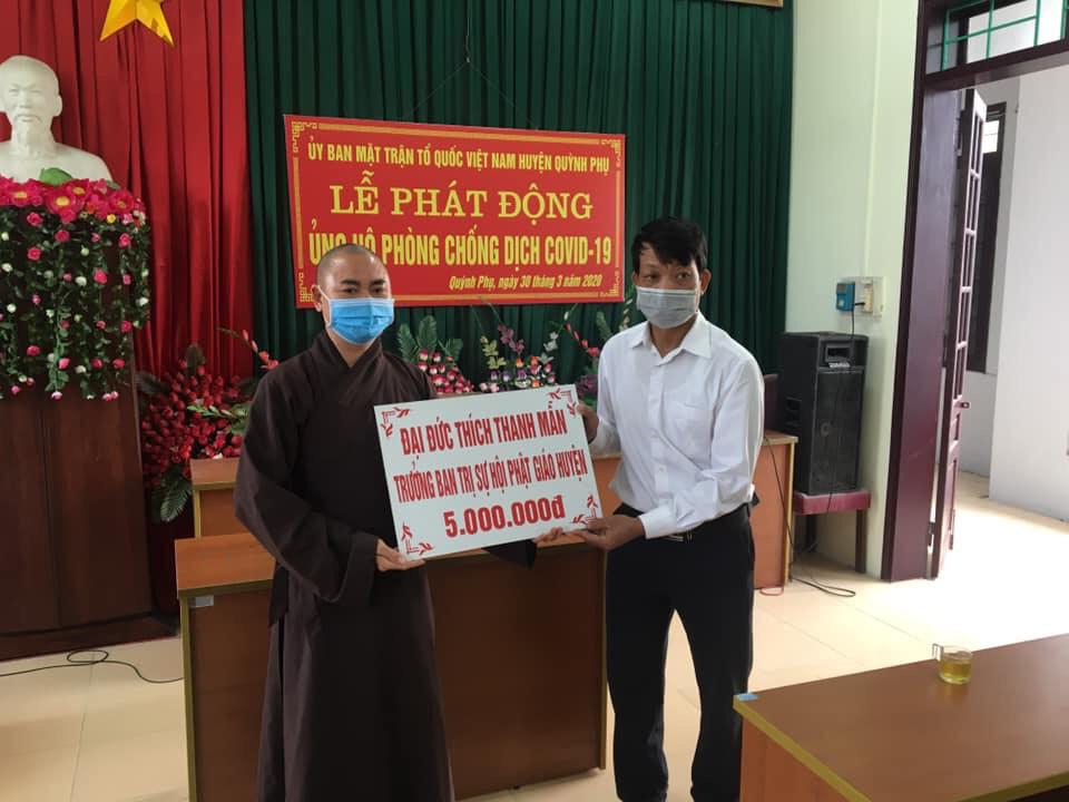 ĐĐ.Thích Thanh Mẫn - Trưởng BTS PG huyện Quỳnh Phụ trao tặng quỹ “Phòng chống dịch Covid-19”