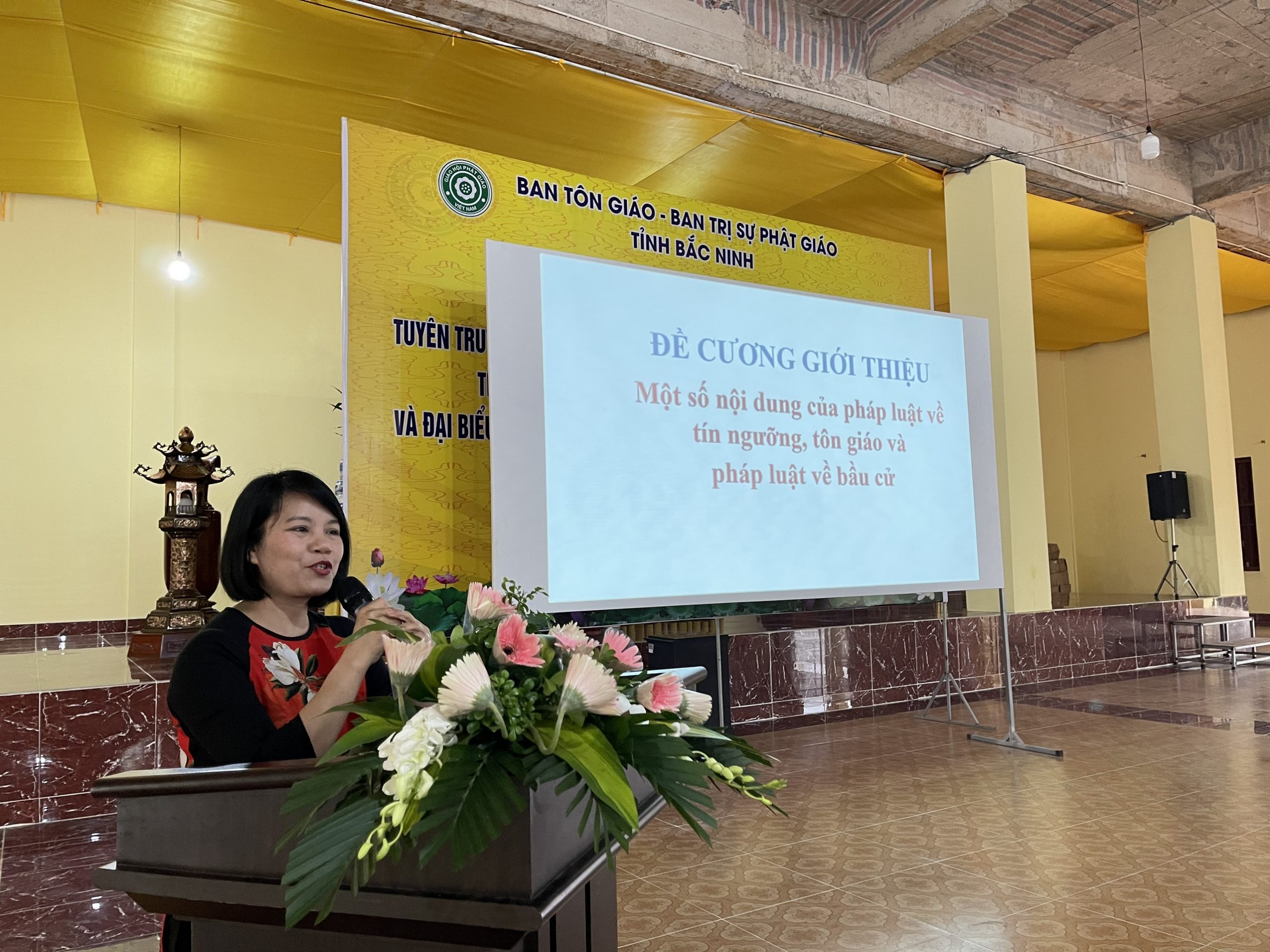Tại Hội nghị, bà Nguyễn Thị Định đã giới thiệu một số nội dung của pháp luật về tín ngưỡng, tôn giáo và pháp luật về bầu cử. Qua đó, đại biểu được tiếp cận các văn bản nội dung: pháp luật về tín ngưỡng, Tôn giáo còn hiệu lực; một số từ ngữ trong Luật và những nội dung liên quan; Thẩm quyền của UBND cấp huyện, cấp xã; Ý nghĩa chính trị của cuộc bầu cử; Vị trí, vai trò của Quốc hội, HĐND các cấp, các quy định của pháp luật và Luật Bầu cử; Vai trò của cử tri với công tác bầu cử, trong đó có đóng góp quan trọng của các chức sắc, chức việc, nhà tu hành Phật giáo trên địa bàn tỉnh tích cực tham gia vào các bước của công tác bầu cử.