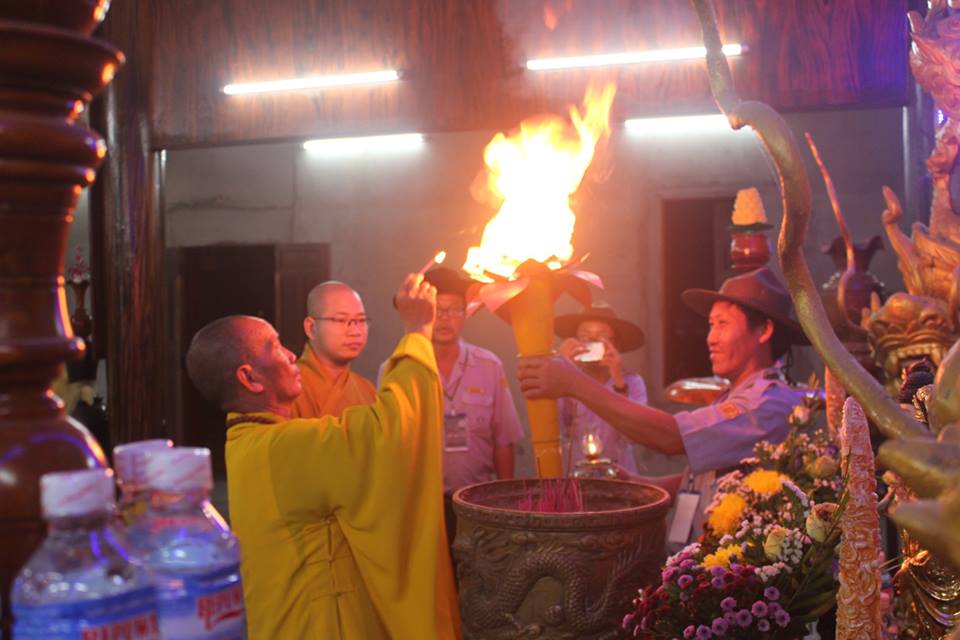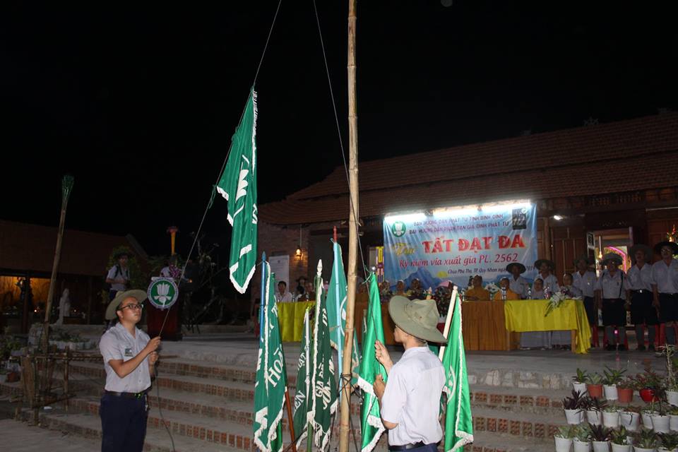 Sau khi ĐĐ. Thích Thị Tấn đã phát biểu khai mạc trại, Ban Quản Trại trình diện và nhận quyết định, còi lệnh và phù hiệu từ thường trực Ban Hướng dẫn Phật tử tỉnh. Huynh Trưởng cấp Tấn Nguyên Trân – Lê Dũng Tý, Ủy viên Tổ kiểm BHD PB GĐPT tỉnh, trại trưởng trại Tất Đạt Đa 2019 đã cung kính đón nhận ngọn lửa Dũng từ chư Tôn đức được tiếp truyền từ đại hùng bảo điện. Ngọn đuốc Dũng sẽ được thắp sáng – tinh thần từ bi, trí tuệ và dũng lực của toàn thể áo lam GĐPT Bình Định nói chung và ngành Nam GĐPT Bình Định nói riêng được bừng cháy. Lửa Dũng sẽ thắp nên hạnh nguyện, thắp nên tinh thần Dũng mãnh của những người Huynh trưởng và những người trai áo lam GĐPT Việt Nam sinh hoạt tại Đất võ hào hùng thân thương này.