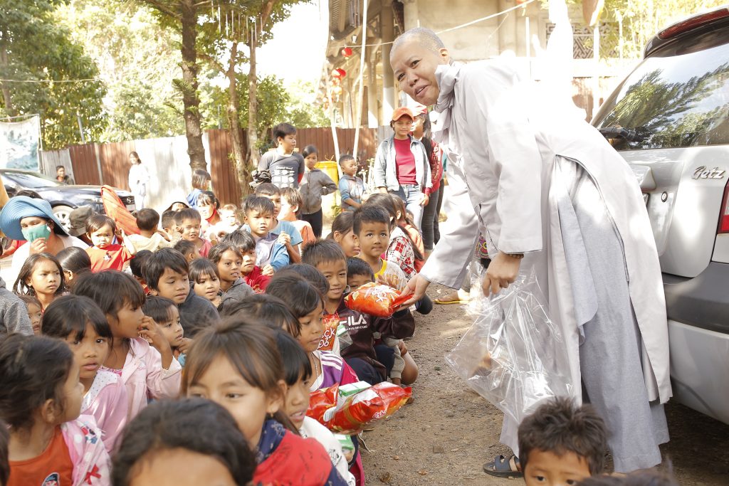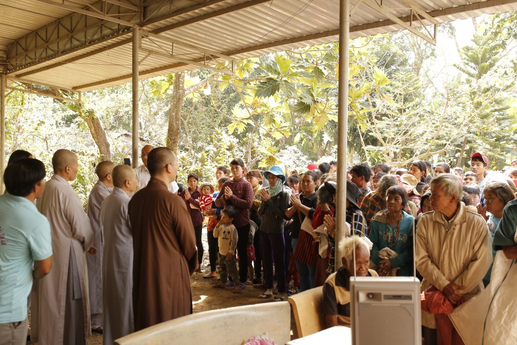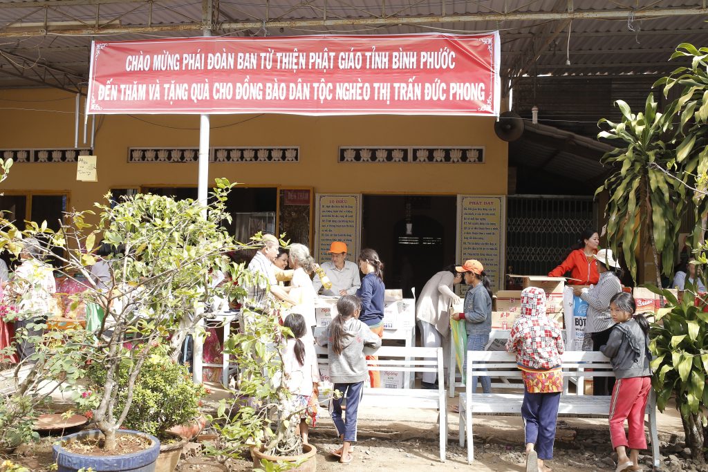 Điểm tiếp theo đoàn đến là xã Bom Bo nơi này đa phần người đồng bào thiểu số. Với 200 phần chia đều về các Sóc, các bản làng người Stieng, Tày, Nùng. Địa điểm trao quà là chùa Thanh An do sư cô TN. Nhuận Trí - Ủy viên Thường trực BTS tỉnh, Phó ban Thường trực BTS PG huyện Bù Đăng làm Trụ trì. Từ khi về làm Phật sự tại địa phương, SC đã chung tay cùng các cấp chính quyền thực hiện ổn định đời sống cho bà con, nhằm an sinh xã hội.