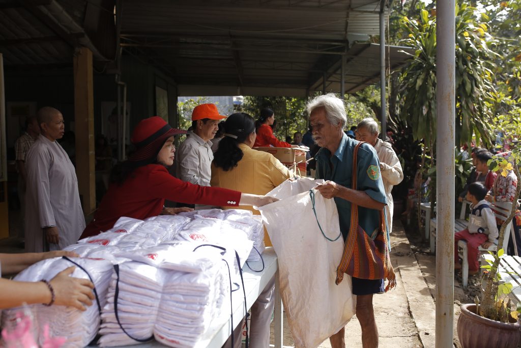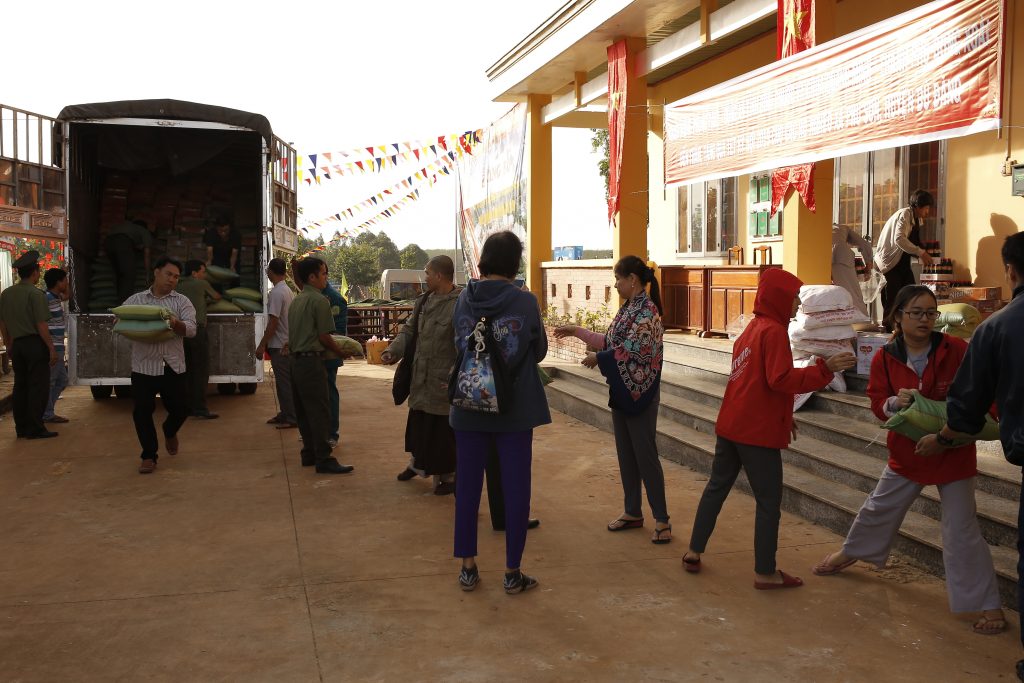 Một phần quà gồm: 10kg gạo, 1 thùng mì, 2 chai nước tương, 1 chai nước mắm, 1 kg đường, 200g bột canh, 2 bịch rau câu, 1 lít dầu ăn, một bịch bánh, (một bao thơ 50 ngàn). Như vậy hơn 1000 phần quà được phát trong đợt này tổng số tiền là trên 300 triệu đồng.