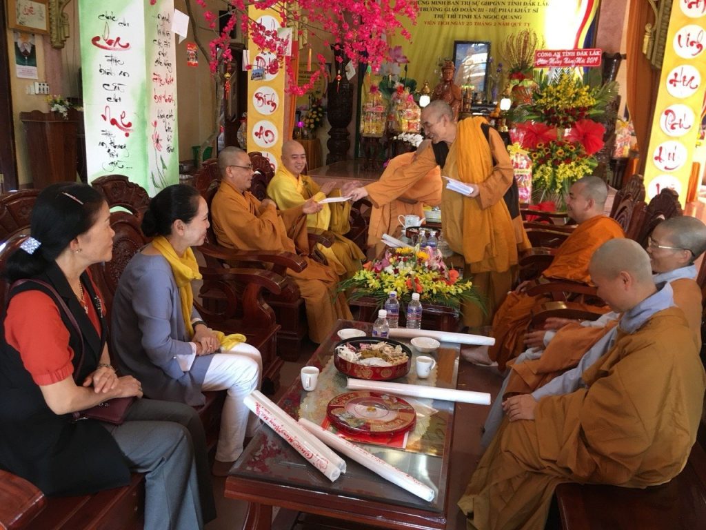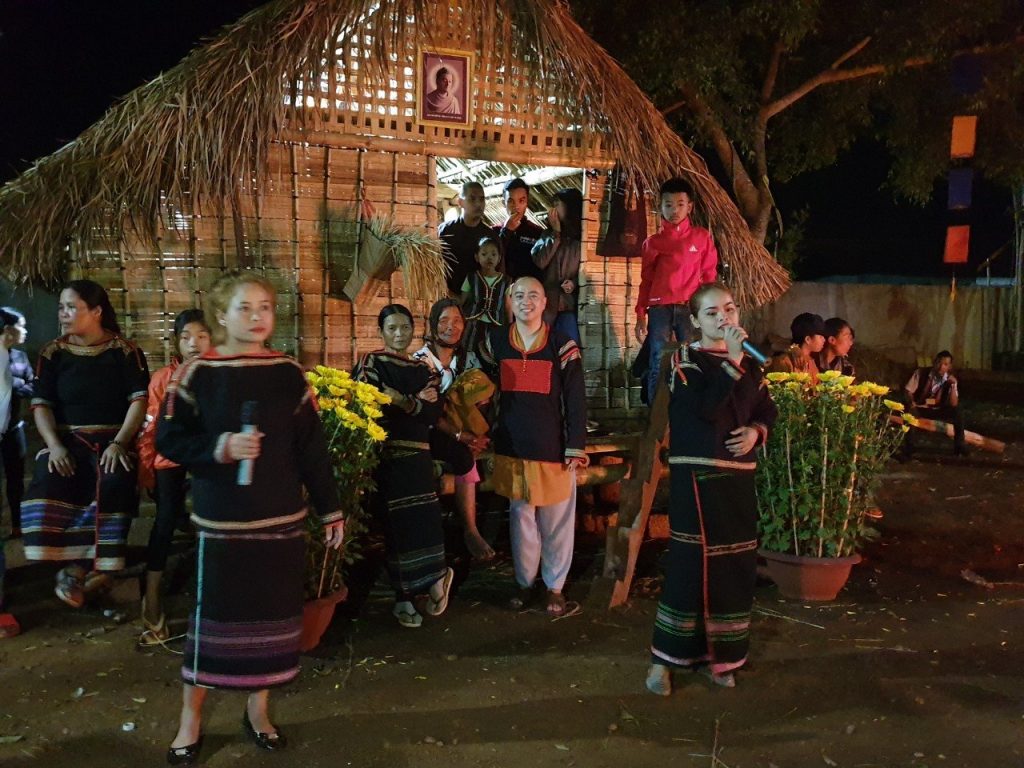 Tiếp đến, đoàn đã thăm và phát lộc đầu xuân cho 100 Phật tử Ê Đê đang sinh hoạt đầu xuân tại bổn tự. 19 giờ cùng ngày bữa tiệc cồng chiêng, văn nghệ, đốt lửa trại chào năm mới do các Phật tử Ê Đê thể hiện, đã để lại dấu ấn đậm nét trong chương trình mừng xuân tại bổn tự, cũng như trong lòng những người tham dự.