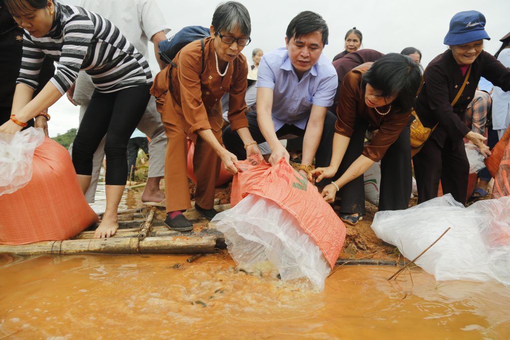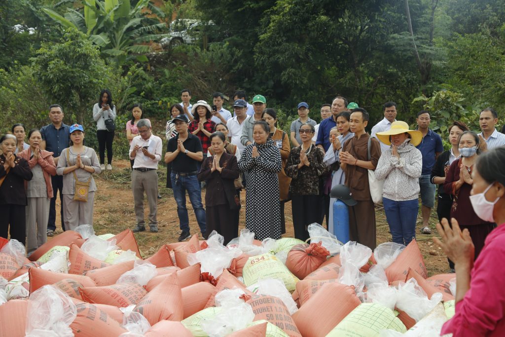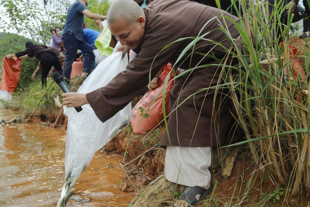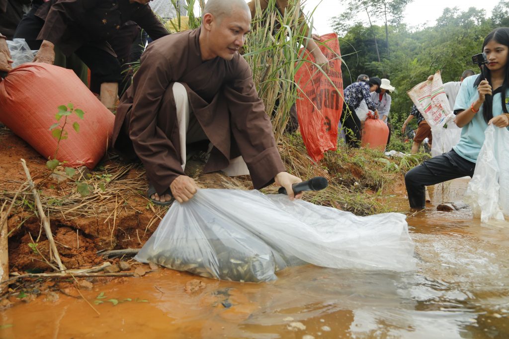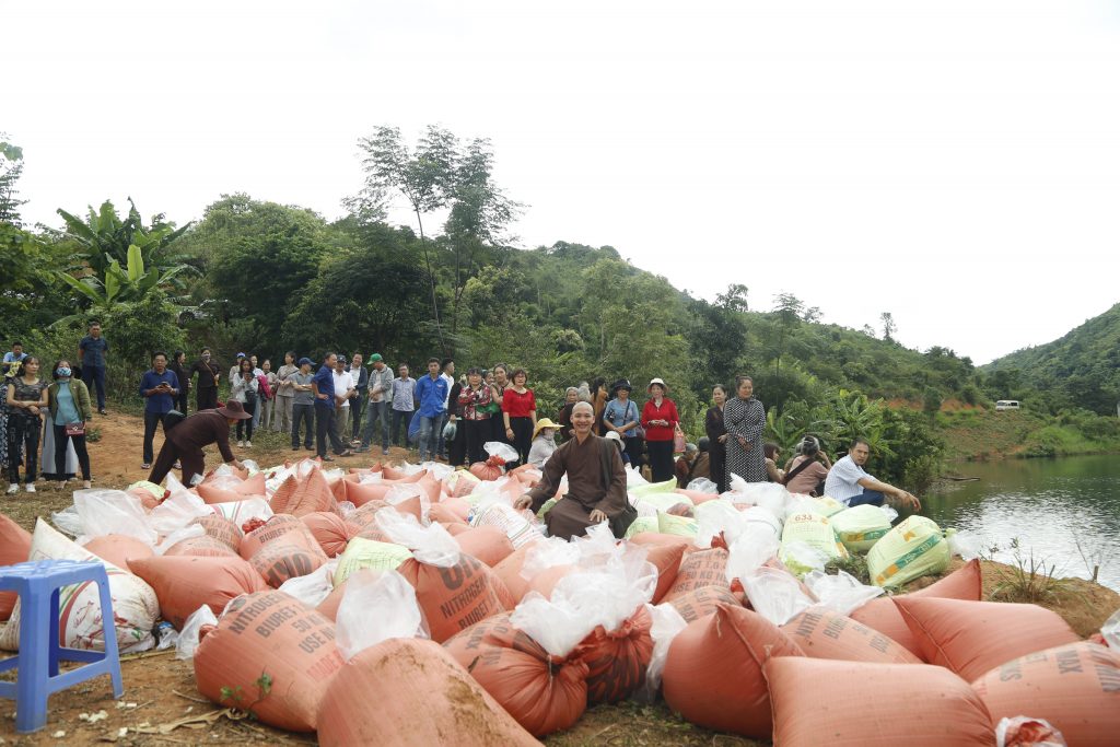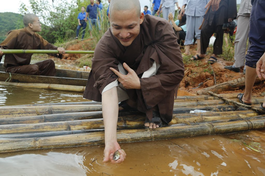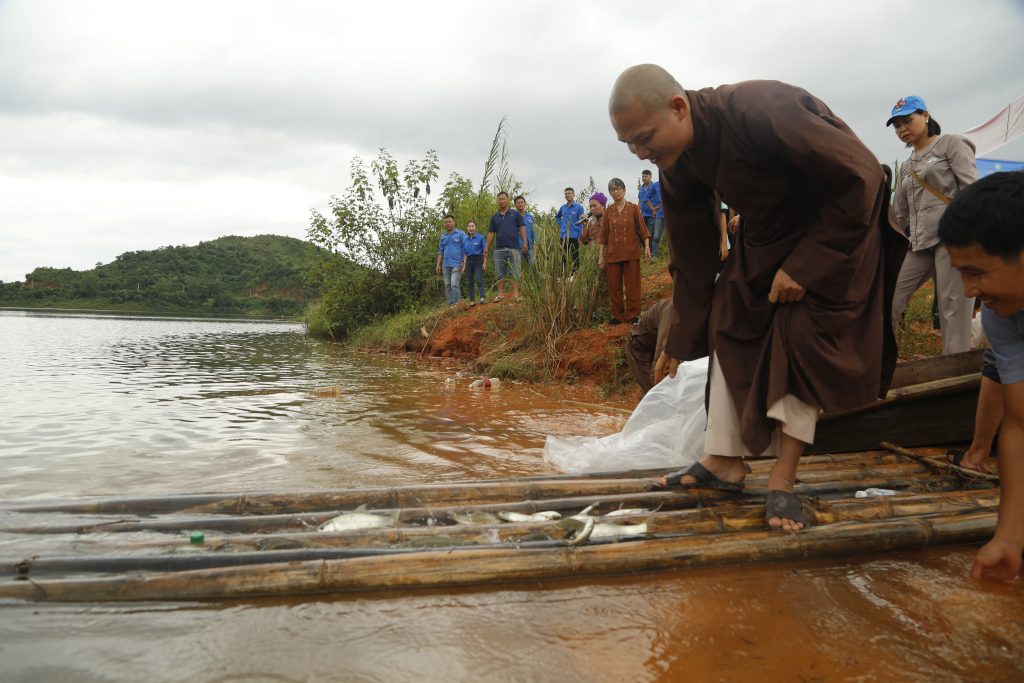 Sau phần nghi thức chú nguyện, đoàn đã cùng các vị Phật tử phóng sanh nguồn cá giống vào môi trường tự nhiên. Phóng sinh là một thiện hạnh vô cùng cao đẹp, thiết thực và cụ thể, góp phần giúp loài thủy tộc có cuộc sống an lành, không bị đe dọa, giết chóc bởi sự vô minh của con người mà còn được gieo duyên lành với Phật pháp.