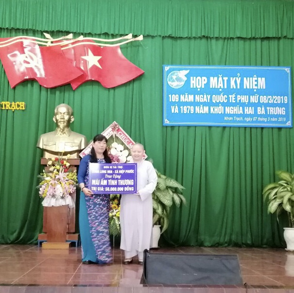 PSO - Hoà cùng niềm vui chung của toàn thế giới, hướng về ngày Quốc tế Phụ nữ 08/03 đại hoan hỷ. Vào lúc 08 giờ sáng ngày 07/03/2019, chùa Long Hoa (222, Hùng Vương, TT. Hiệp Phước, H. Nhơn Trạch, T. Đồng Nai). Thực hiện chương trình từ thiện vì mọi người, trao niềm vui nhân ngày ý nghĩa. Tặng 01 căn nhà tình thương, 20 Bảo hiểm Y tế Cho những người phụ nữ có hoàn cảnh khó khăn trong huyện Nhơn Trạch và Phát 300 phần cơm chay tại Bệnh Viện Đa Khoa H. Nhơn Trạch.