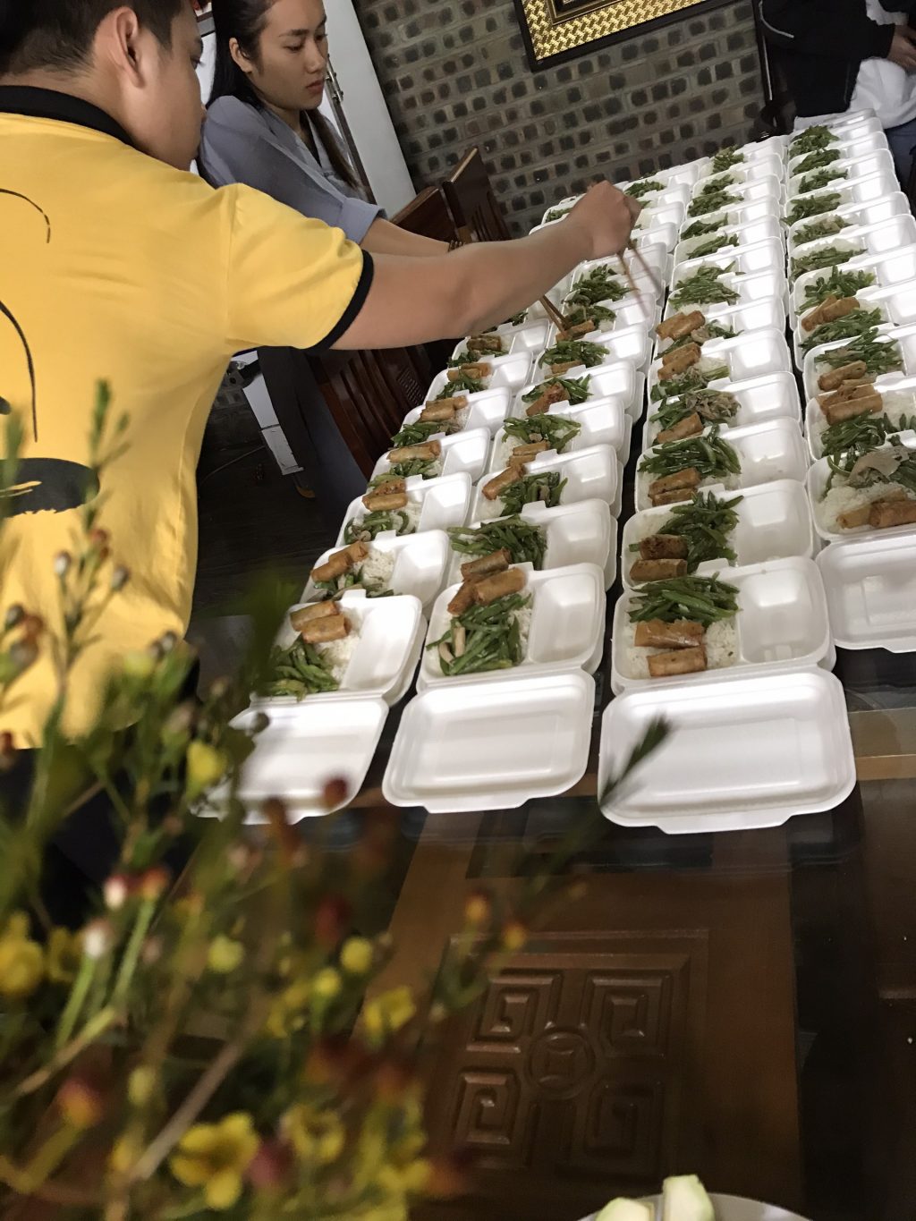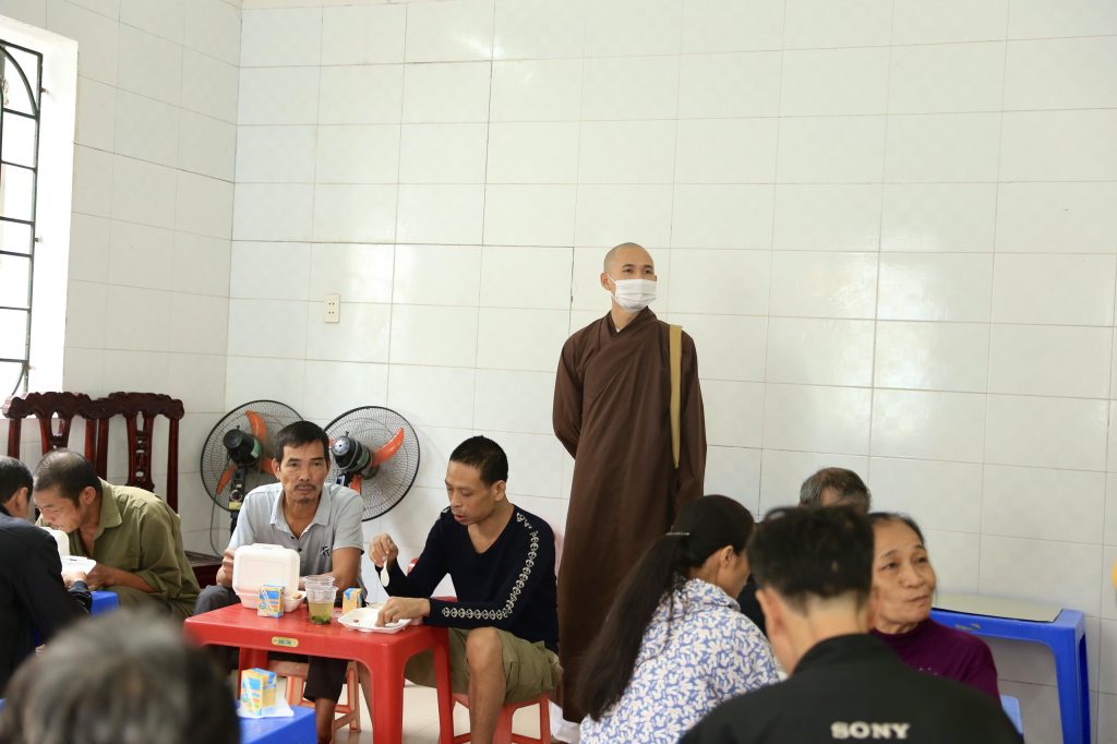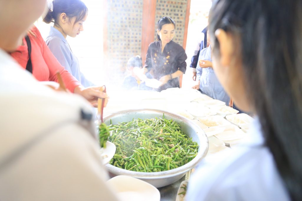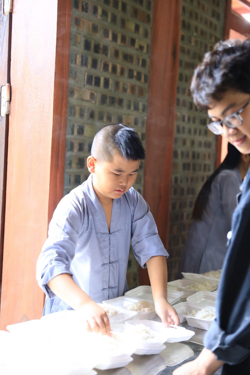 Ngay từ sáng sớm, bên hiên bếp của Chùa, ánh lửa đã đỏ rực, làn khói bếp nhè nhẹ quyện với sương mai, căn bếp ấm lên bởi nụ cười hoan hỷ trên những gương mặt rạng ngời của người con Phật được trở về công phu lao tác, chuẩn bị những phần cơm chay ngon bổ dưỡng. Tâm Bồ đề và tâm yêu thương, chia sẻ được thể hiện qua những phút giây thật bình dị từ nhặt rau, đun nước, chia cơm,... 250 phần cơm chay nhanh chóng hoàn thành để kịp giờ bữa trưa của các bệnh nhân. Những phần cơm ấy không chỉ thơm từ gia vị của rau củ quả mà nêm nếm vào ấy là hương vị của tình người, hương vị của tinh thần từ bi mà Đức Thế Tôn đã truyền dạy.