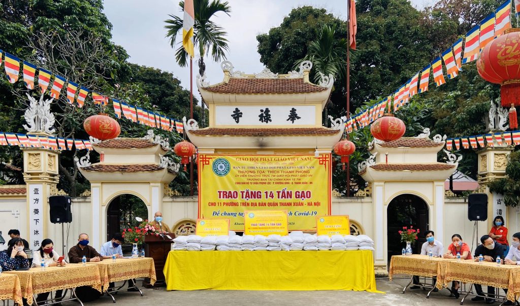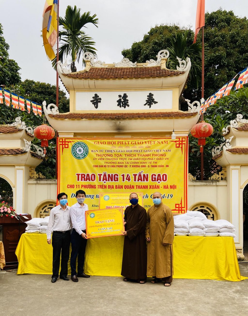 PSO - Sáng ngày 20/04/2020, dưới sự chỉ đạo và ủy quyền của Thượng tọa Thích Thanh Phong - Ủy viên Thường trực HĐTS, Trưởng ban Kinh tế Tài Chính TƯ GHPGVN; Đại đức Thích Quảng Lâm - Ủy viên HĐTS, Ủy viên ban Phật giáo Quốc tế TƯ đã về tại chùa Phụng Lộc, phố Khương Hạ, phường Khương Đình, quận Thanh Xuân, TP. Hà Nội để trao 14 tấn gạo cho 11 phường trên địa bàn của quận Thanh Xuân với mong muốn cùng chung tay phòng chống dịch Covid-19. Về dự và nhận quà có bà Lê Mai Trang - Ủy viên Thường vụ Quận ủy, Phó chủ tịch UBND quận Thanh Xuân; Bà Nguyễn Thu Trang - Trưởng phòng Văn hóa quận Thanh Xuân cùng 11 Phó chủ tịch UBND các phường trong địa bàn của quận. Tại buổi lễ, 14 tấn gạo đã được trao cho đại diện các phường. Sau đó số gạo sẽ được phân phát tận tay cho bà con có hoàn cảnh khó khăn, người lao động nghèo tại địa phương bị ảnh hưởng do đại dịch Covid-19. Các phần gạo cũng nhằm động viên, khích lệ bà con, nhân dân địa phương vững tâm thực hiện nghiêm Chỉ thị của Thủ tướng Chính phủ để Việt Nam sớm vượt qua đại dịch. Thay mặt bà con nhân dân quận Thanh Xuân, bà Lê Mai Trang trân trọng gửi lời cảm ơn đến Thượng tọa Thích Thanh Phong cùng Ban hộ tự, các nhà hảo tâm đã chung tay, chia sẻ trách nhiệm với cộng đồng xã hội, góp phần giúp đỡ các hộ dân vượt qua khó khăn, ổn định cuộc sống trong thời gian cách ly xã hội do dịch bệnh Covid-19.