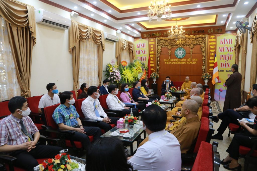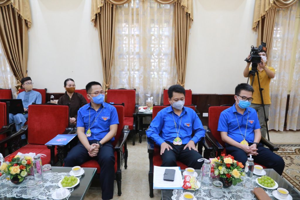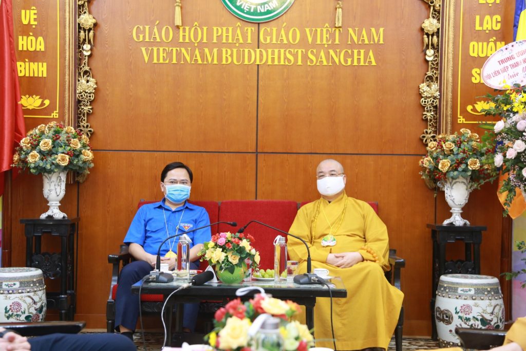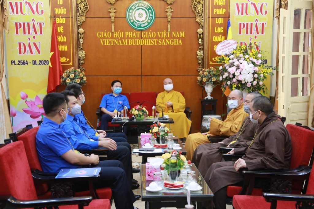 Chiều cùng ngày, đoàn Chủ tịch Liên Hiệp Thanh Niên Việt Nam (HLHTNVN) đã đến thăm, gửi lời chúc mừng đến TƯGH nhân dịp Phật đản PL.2564 – DL.2020. Dẫn đoàn có anh Nguyễn Anh Tuấn – Bí thư Thường trực Trung ương Đoàn, Chủ tịch Hội Liên Hiệp Thanh Niên Việt Nam làm trưởng đoàn cùng các Bí thư, trợ lý.Thân mật đón tiếp phái đoàn có HT. Thích Thanh Nhiễu – Phó Chủ tịch Thường trực HĐTS GHPGVN, Phó Trưởng ban Tăng sự TƯ; TT. Thích Đức Thiện - Phó Chủ tịch kiêm Tổng Thư ký HĐTS GHPGVN, Trưởng Ban Phật Giáo Quốc tế TƯ; ĐĐ. Thích Nguyên Chính - Ủy viên HĐTS, Phó Chánh Văn phòng I TƯGH, Thành viên Đoàn Chủ tịch Hội Liên Hiệp Thanh Niên Việt Nam.