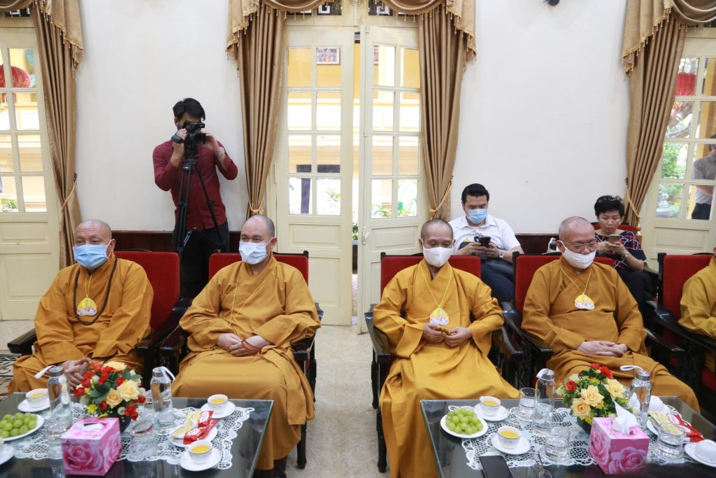 Thân mật đón tiếp đoàn lãnh đạo có HT. Thích Thanh Nhiễu – Phó Chủ tịch Thường trực HĐTS, Phó Trưởng Ban Thường trực Ban Tăng sự TƯ GHPGVN; HT. Thích Gia Quang – Phó Chủ tịch HĐTS, Trưởng Ban Thông tin Truyền thông T.Ư; TT. Thích Đức Thiện – Phó Chủ tịch, Tổng Thư ký HĐTS, Trưởng Ban Phật Giáo Quốc tế TƯ; HT. Thích Thanh Điện – Phó Tổng Thư ký HĐTS, Chánh văn phòng I T.Ư GHPGVN; HT. Thích Thanh Đạt - Ủy viên Thư ký HĐTS GHPGVN; TT. Thích Thanh Huân - Ủy viên Thư ký HĐTS, Phó chánh Văn phòng I T.Ư GHPGVN; TT. Thích Thanh Tuấn - Ủy viên Thường trực HĐTS, Phó Chánh Văn phòng 1 TƯ GHPGVN; ĐĐ. Thích Nguyên Chính - Ủy viên HĐTS, Phó Chánh Văn phòng 1 TƯ GHPGVN. Phái đoàn lãnh đạo thành phố Hà Nội tới thăm chùa Quán Sứ do ông Vương Đình Huệ - Ủy viên Bộ Chính trị, Bí thư Thành ủy, Trưởng đoàn Đại biểu Quốc hội thành phố Hà Nội làm trưởng đoàn.