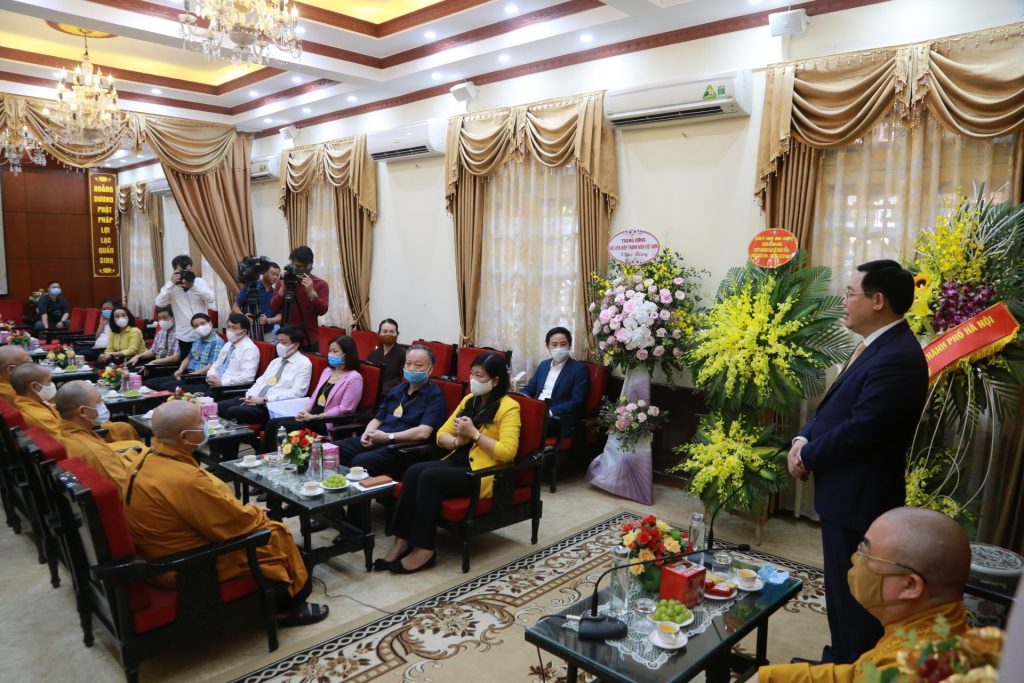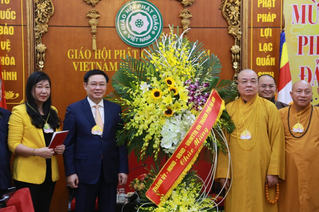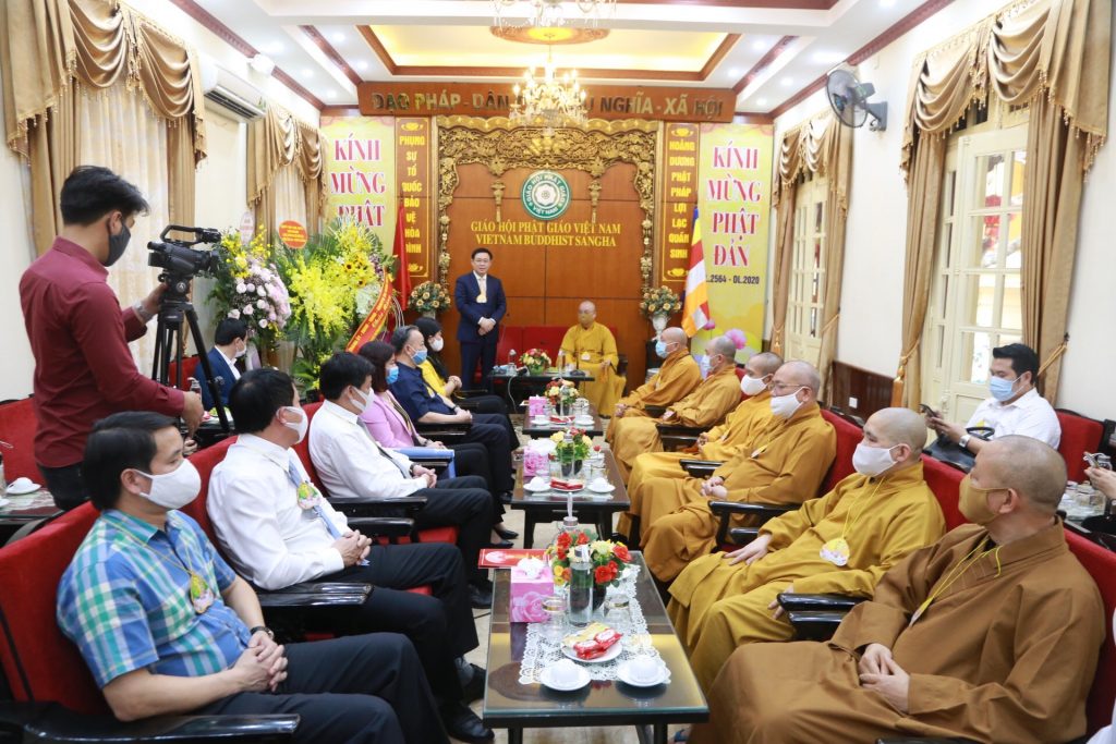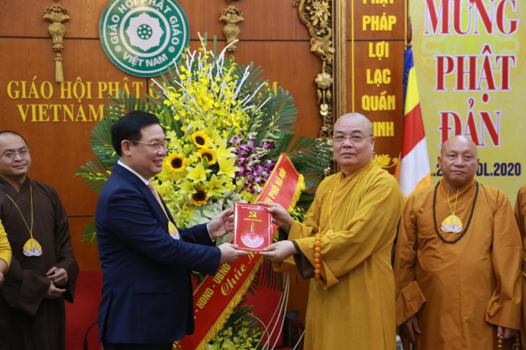 Tại buổi gặp mặt, ông Vương Đình Huệ đã bày tỏ sự đánh giá cao những nỗ lực đã đạt được của Giáo hội trong quá trình phát triển với tinh thần “hộ quốc an dân”, đồng hành cùng dân tộc. Với Thủ đô Hà Nội, thành tựu của ngày hôm nay còn có sự chung tay góp sức của các Tăng Ni Phật tử. Qua việc tổ chức thành công Đại lễ Vesak năm 2019 tại chùa Tam Chúc vừa qua đã quảng bá hình ảnh, văn hóa, đất nước, con người Việt Nam và tôn giáo đến với bạn bè trên thế giới. Riêng năm nay, cả thế giới nói chung và Việt Nam nói riêng đang phải gồng mình chống dịch covid 19. Nhờ sự chỉ đạo sát sao của Chính phủ và Giáo hội cùng sự đồng lòng của cộng đồng nên đã kiểm soát tốt việc lây lan dịch bệnh. Bên cạnh đó, công tác từ thiện đang được đẩy mạnh, góp phần giúp đỡ người dân vượt qua được hoàn cảnh khó khăn để ổn định kinh tế. Tại đây, ông Vương Đình Huệ đã thay mặt đoàn lãnh đạo trao tặng đến T.Ư GHPGVN những lẵng hoa tươi thắm và gửi lời chúc mừng đến chư tôn đức giáo phẩm nhân dịp Phật đản năm 2020.