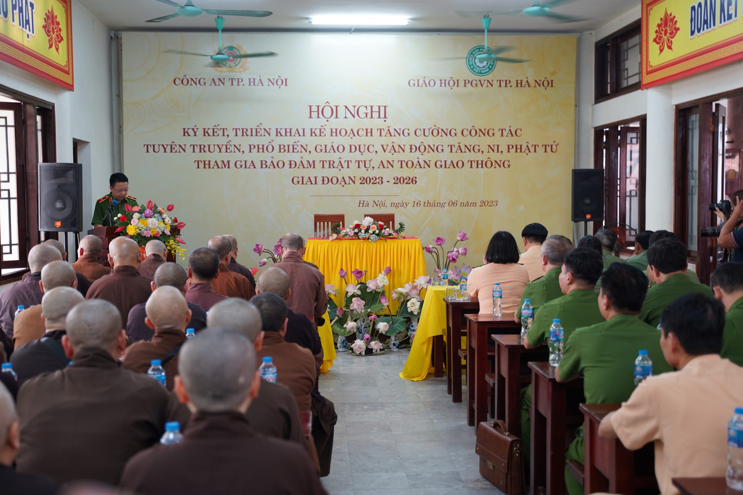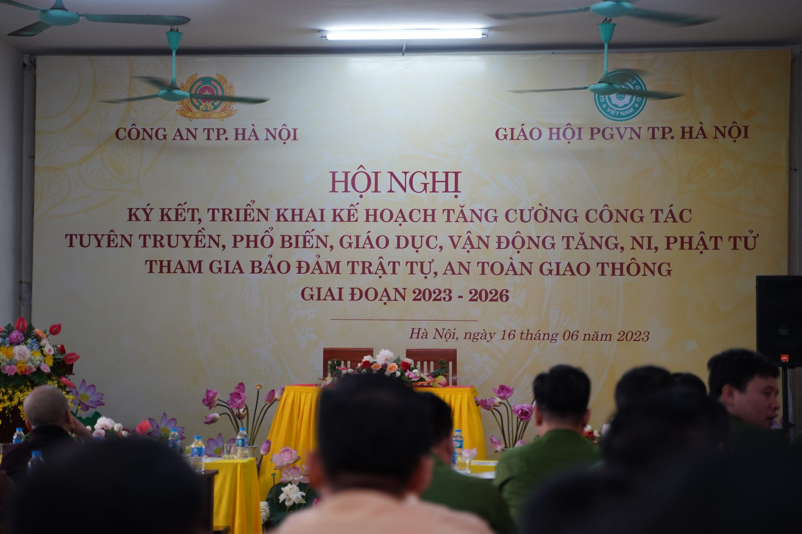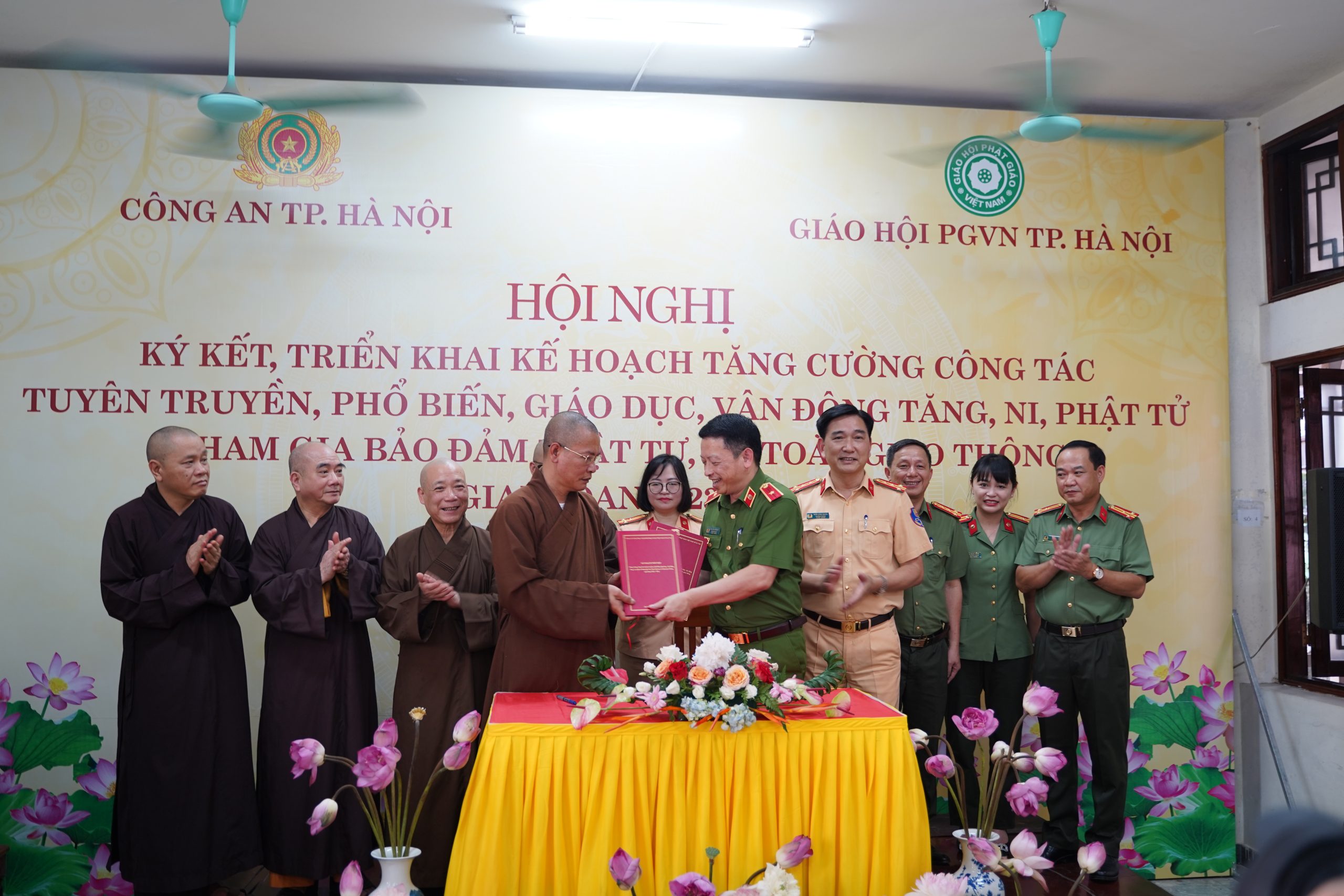 Kết thúc buổi lễ, Thượng toạ Thích Đạo Phong đã thay mặt cho BTS GHPGVN TP ký kết kế hoạch phối hợp “Tăng cường công tác tuyên truyền, phổ biến, giáo dục, vận động tăng, ni, Phật tử tham gia bảo đảm TTATGT giai đoạn 2023 – 2026” với CATP Hà Nội.