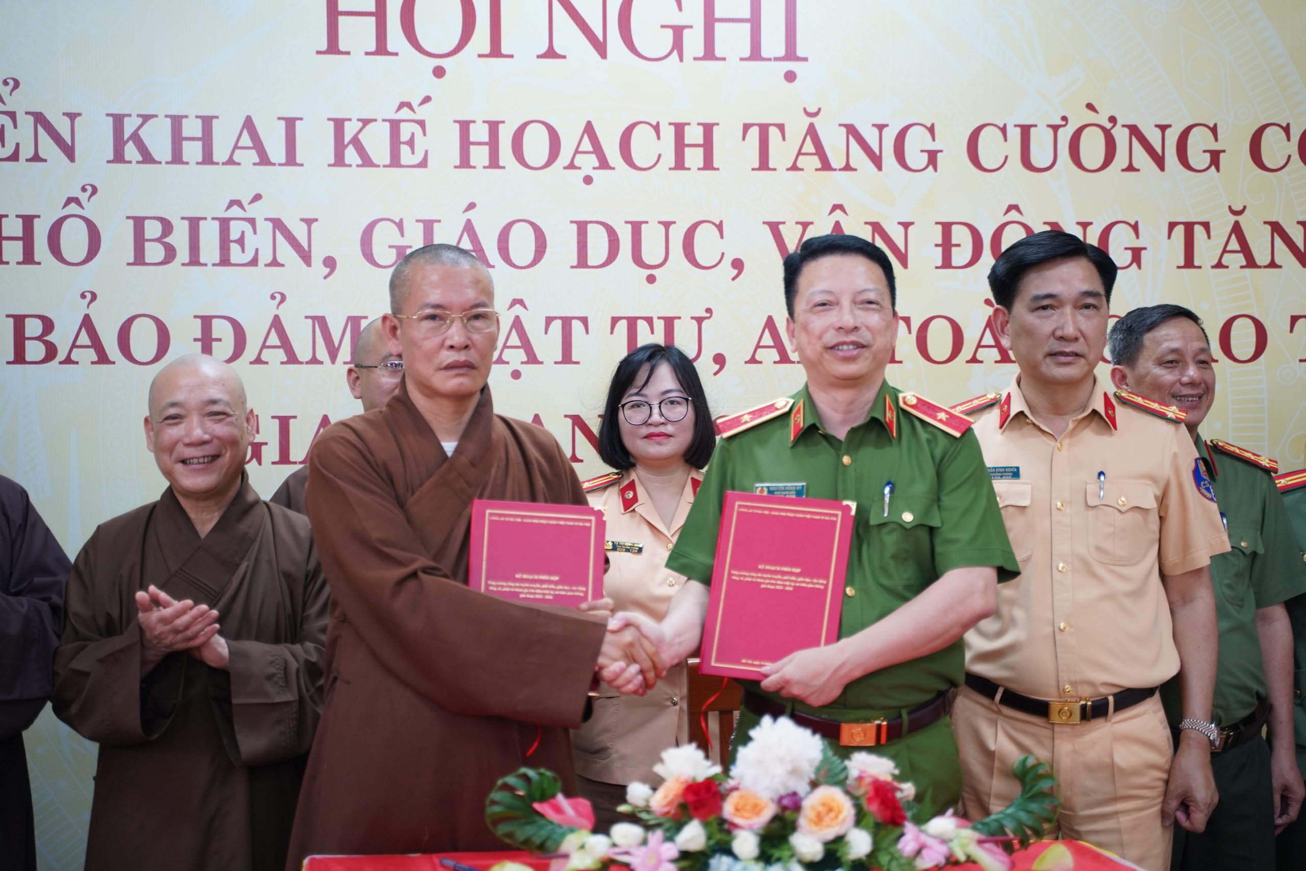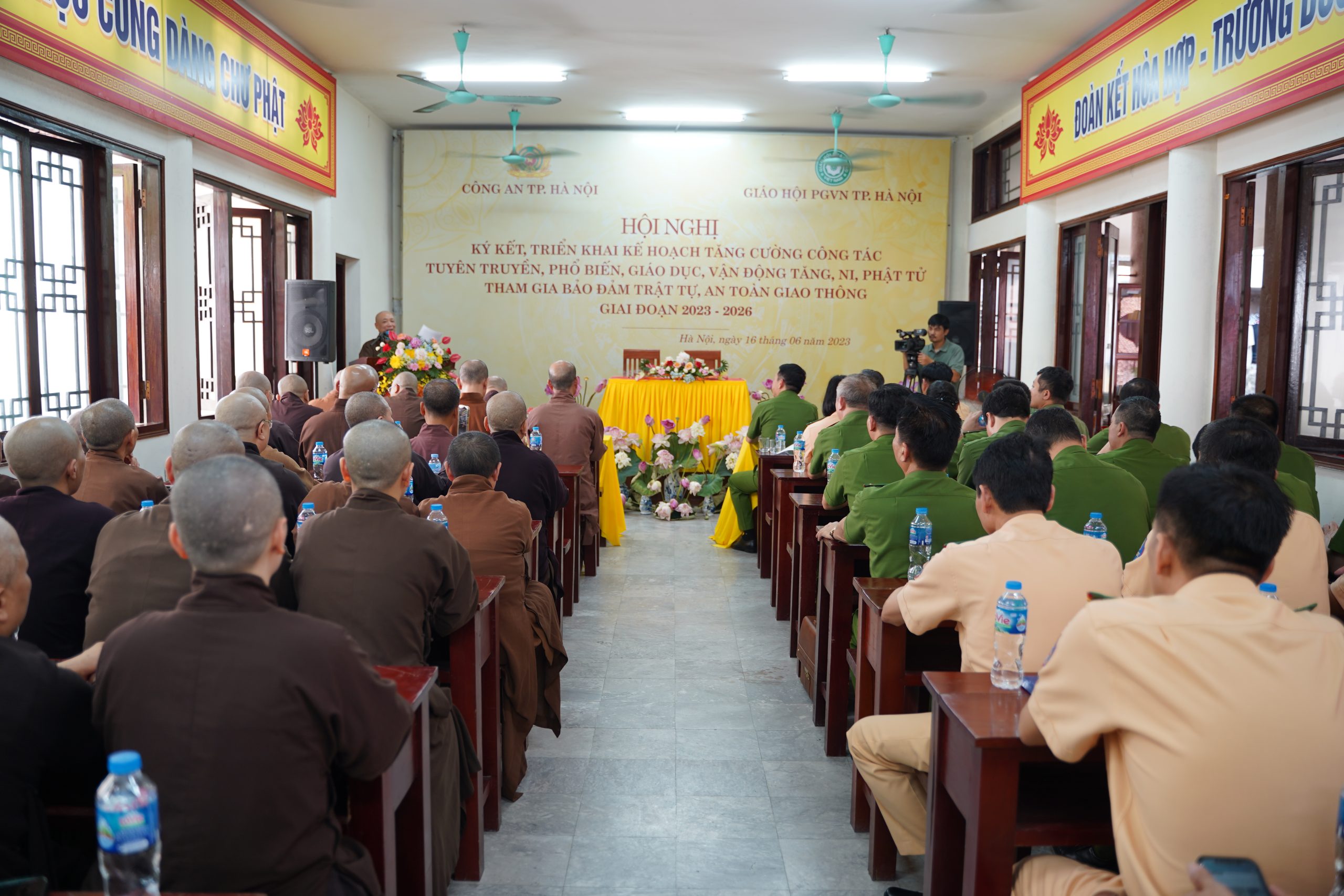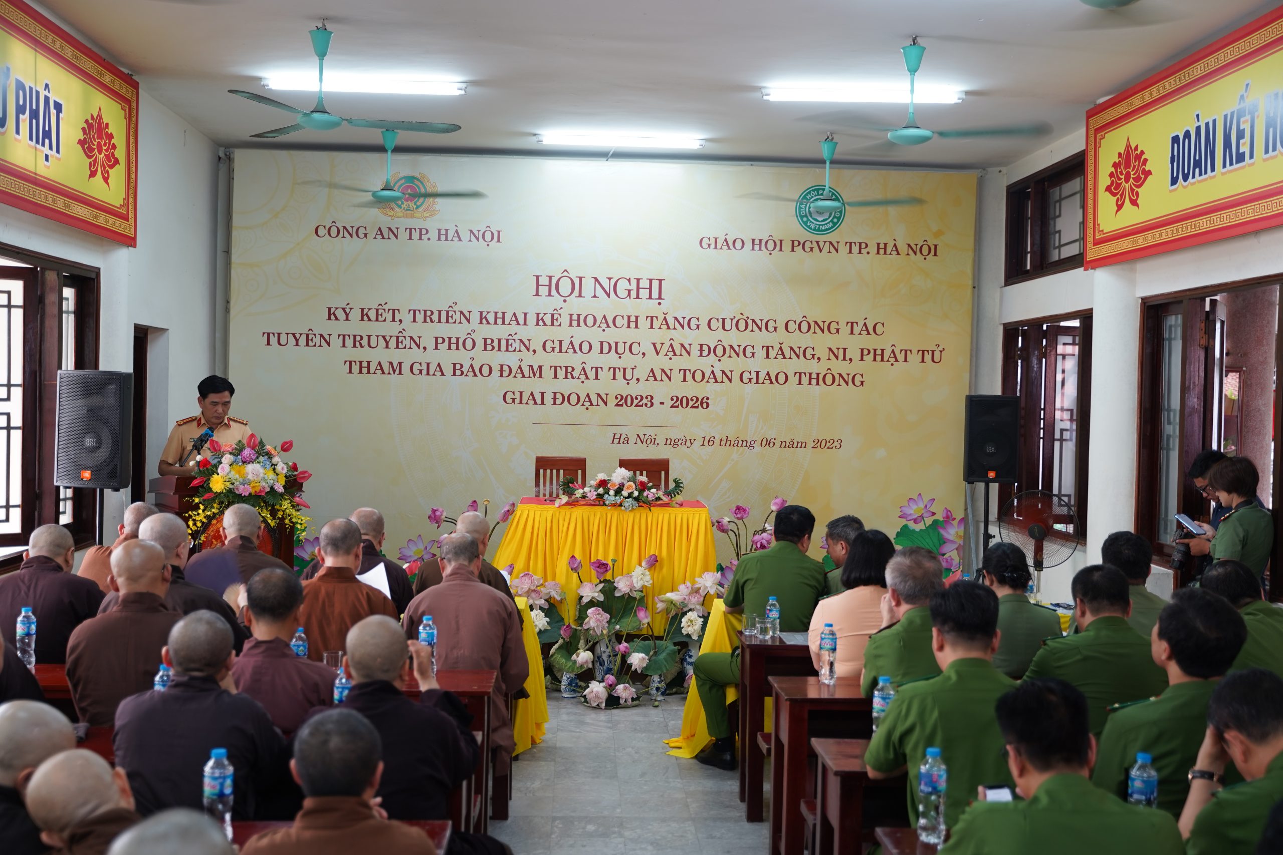 Kết thúc buổi lễ, Thượng toạ Thích Đạo Phong đã thay mặt cho BTS GHPGVN TP ký kết kế hoạch phối hợp “Tăng cường công tác tuyên truyền, phổ biến, giáo dục, vận động tăng, ni, Phật tử tham gia bảo đảm TTATGT giai đoạn 2023 – 2026” với CATP Hà Nội.