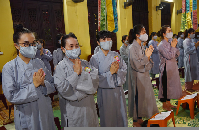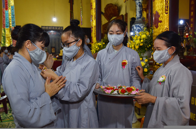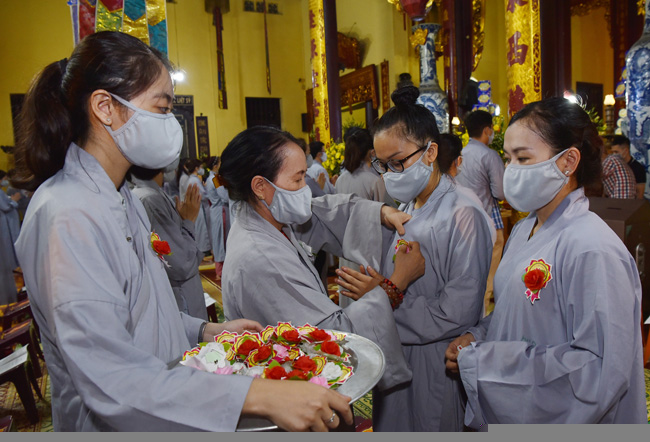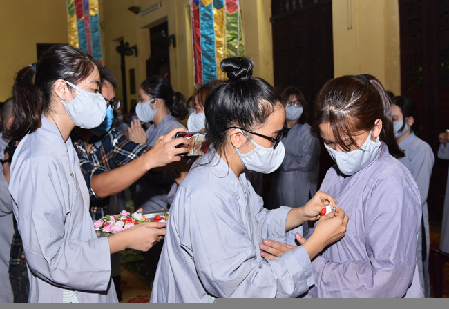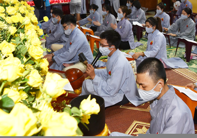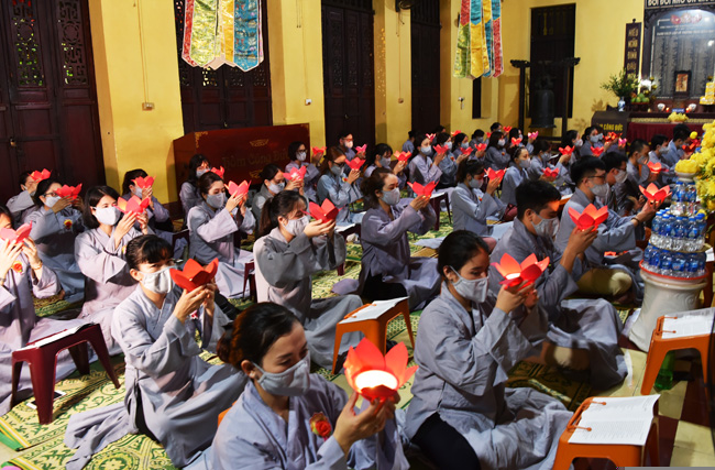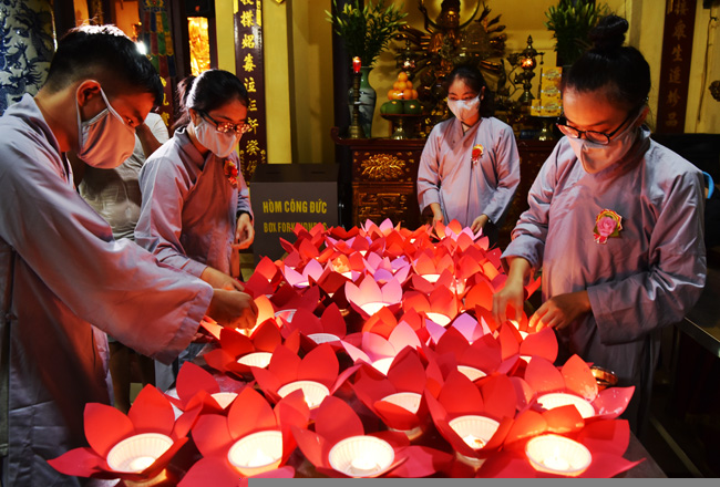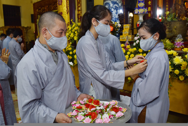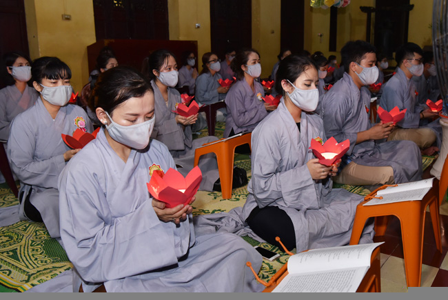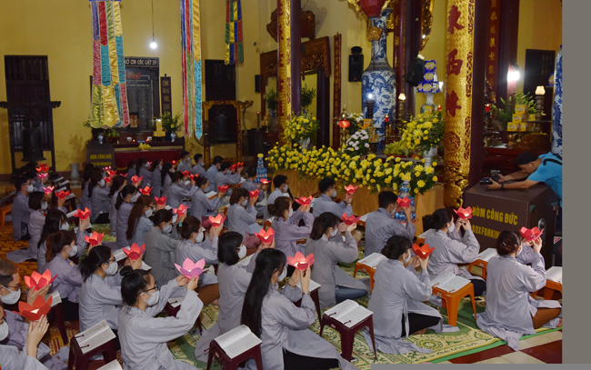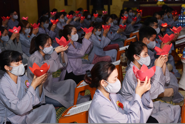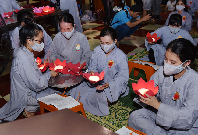 Trước nghi lễ bông hồng cài áo, Phật tử Tâm Viên - Hoàng Mỹ Tâm xúc động đọc lời cảm niệm ơn đức sinh thành của cha mẹ. Toàn thể đại chúng cùng dốc lòng hướng về Tam bảo niệm Phật, tụng kinh Vu lan Báo hiếu và dâng nến cầu nguyện cho các hương linh quá vãng được siêu sinh tịnh độ. Cầu nguyện cho Quốc thái dân an - Dịch bệnh tiêu trừ - Thế giới hòa bình - Chúng sinh an lạc. Buổi lễ đã kết thúc thành tựu viên mãn trong không khí tràn đầy Đạo vị.Xin giới thiệu một số hình ảnh tại buổi lễ.