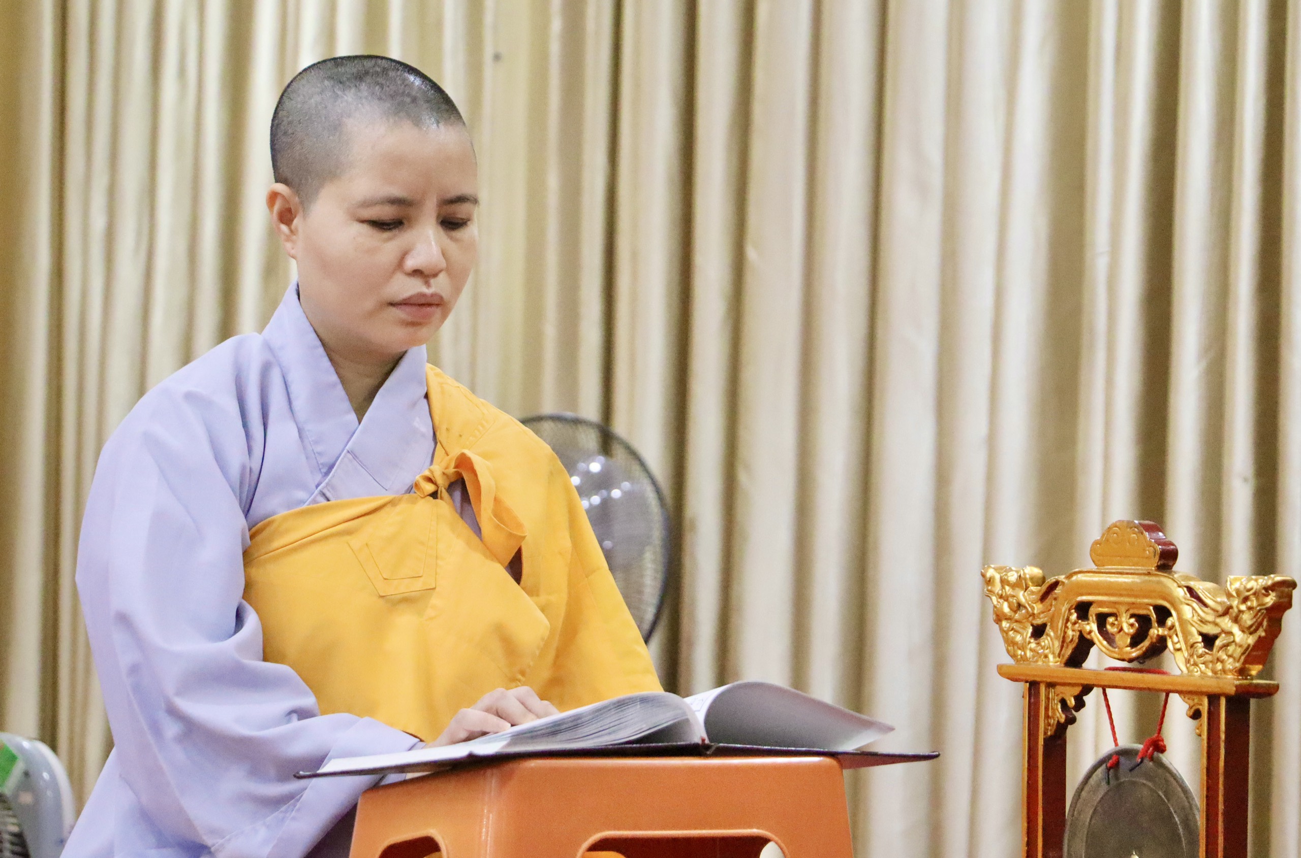 Tăng sinh Thích Minh Nhẫn, Thích Quảng Trí được Đại Tăng sai cử tụng giới. Ngoài ra. chúng Sa di và Hình đồng sau khi nghe giáo giới được chư Tăng hướng dẫn tụng “24 chương uy nghi dành cho người xuất gia”. Chư Tăng đồng thanh tụng lại các giới luật được đức Phật chế định, tự thúc liễm thân tâm và trang nghiêm Tăng đoàn. Sau khi lễ Bố tát hoàn mãn, Đại đức Chánh Văn phòng đã có đạo từ, nhận định phần tụng giới sáng nay và sách tấn đại chúng học tập Giới kinh.. Đại chúng đều nhất tâm hoan hỷ, y giáo phụng hành.