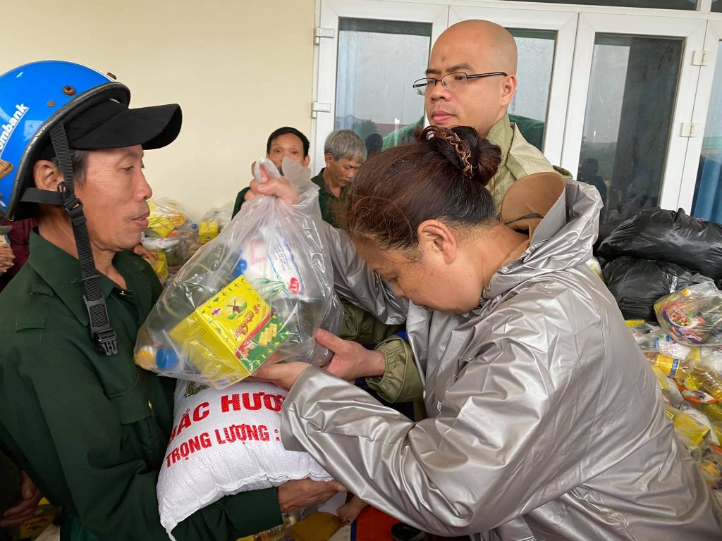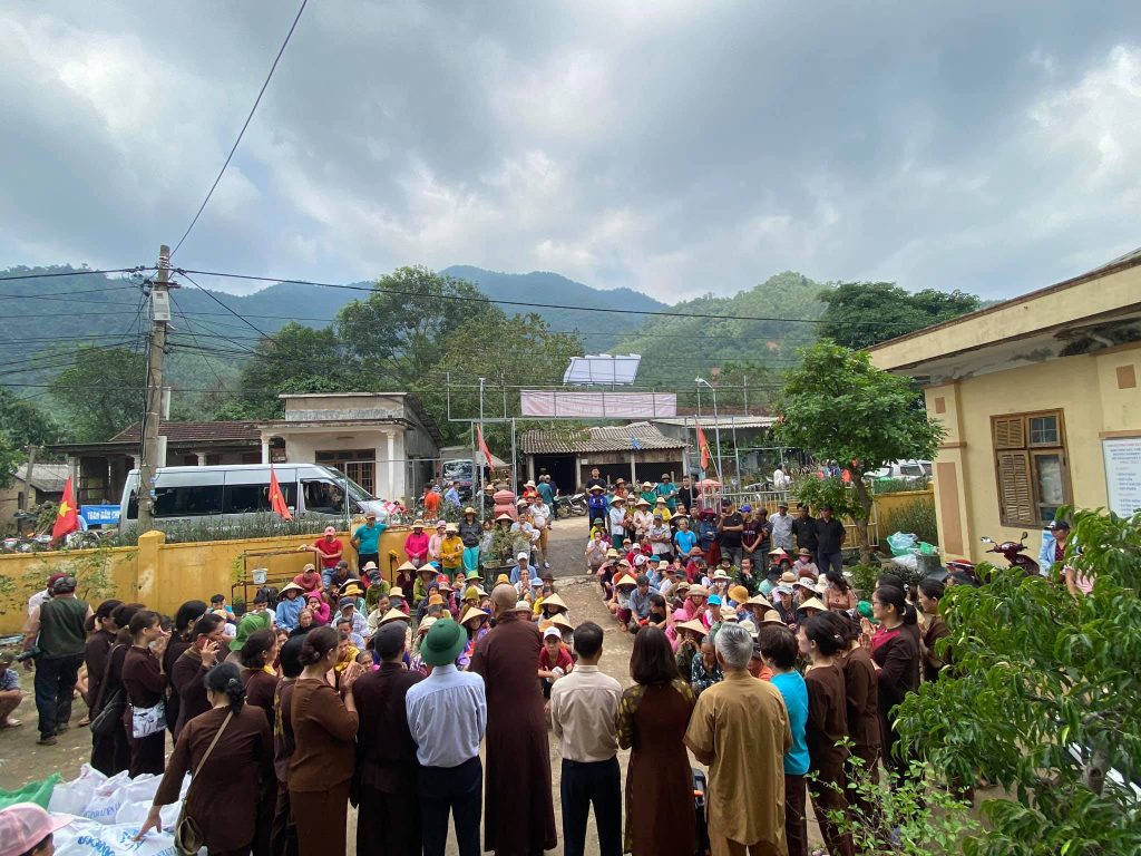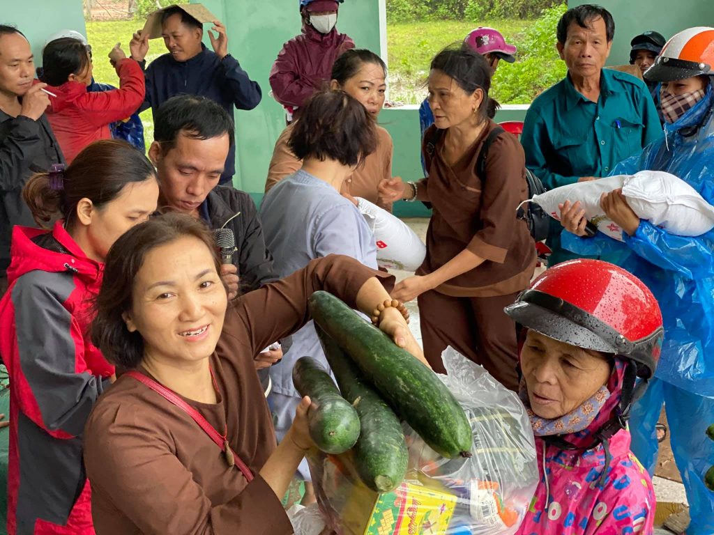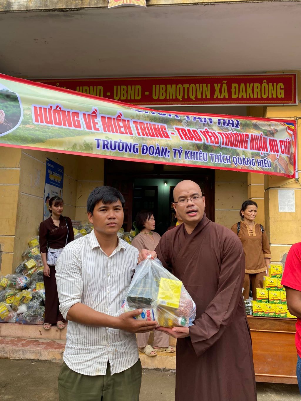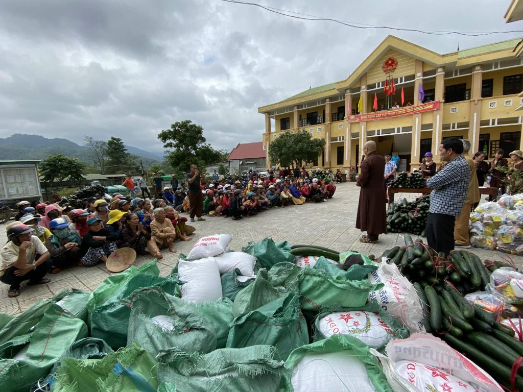 ĐĐ. Thích Quảng Hiếu và Phật tử đaọ tràng chùa Tân Hải tặng quà cho bà con vùng lũ