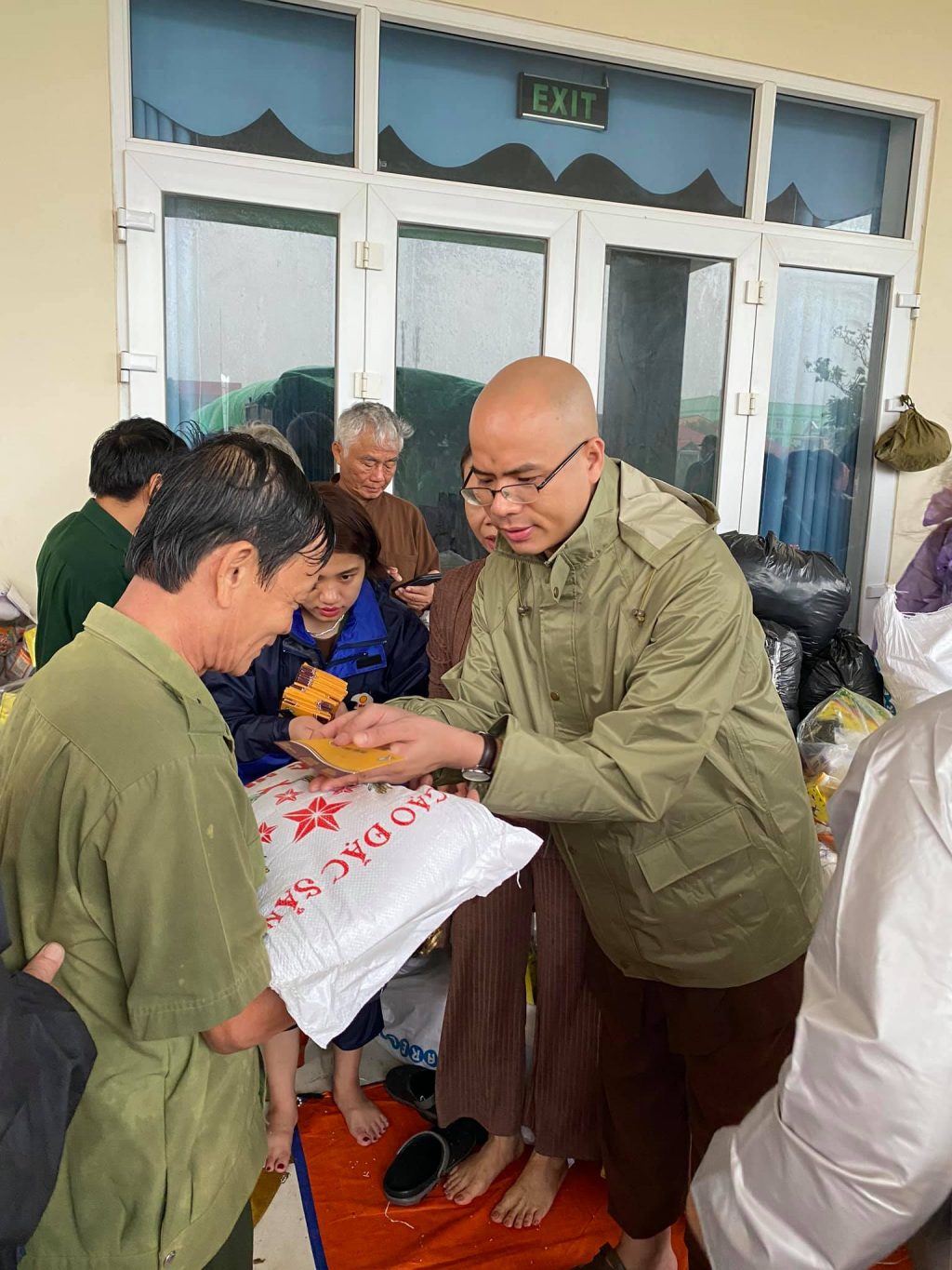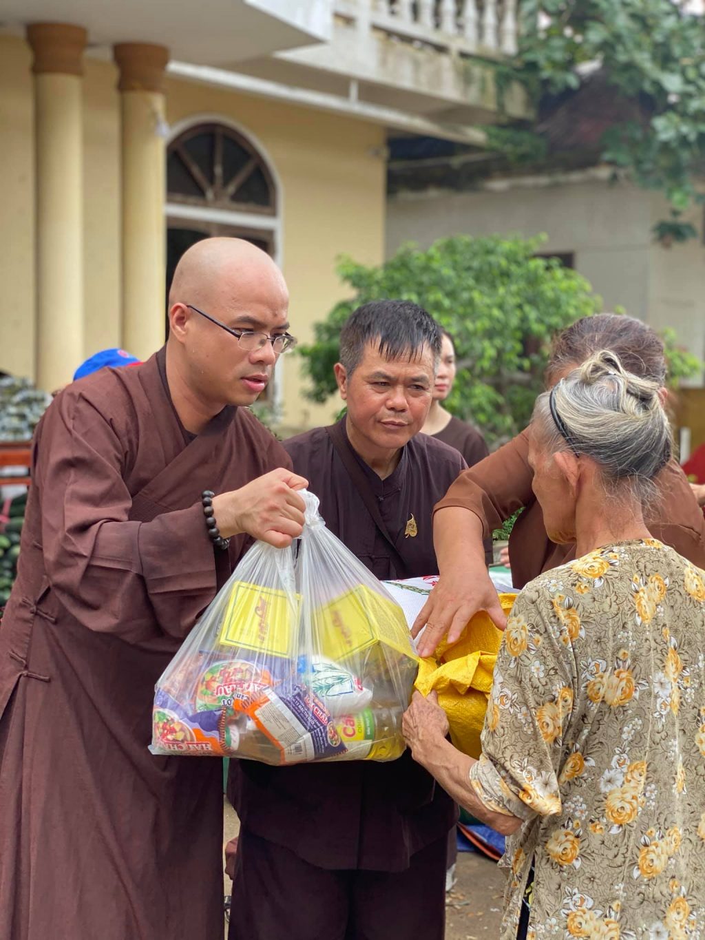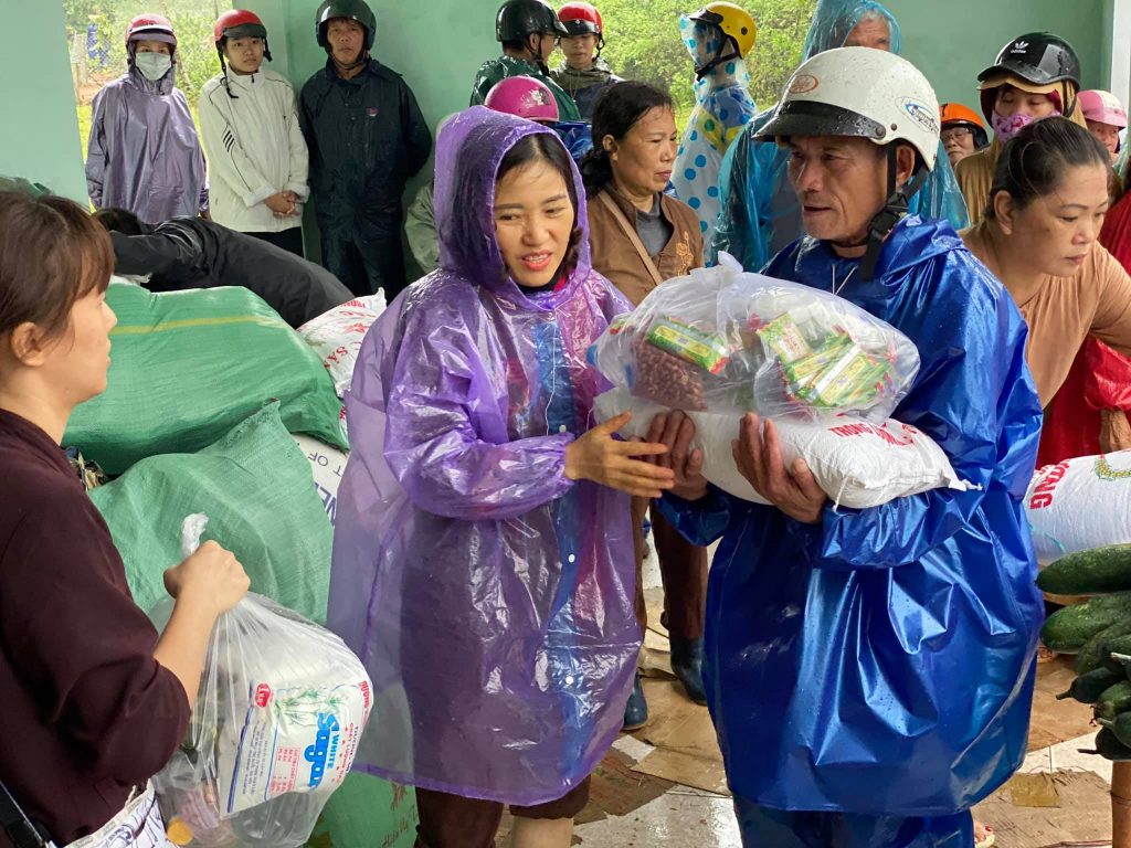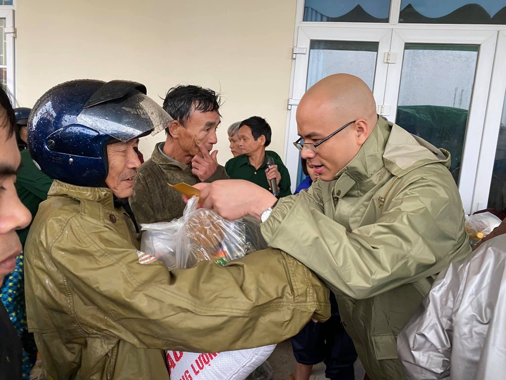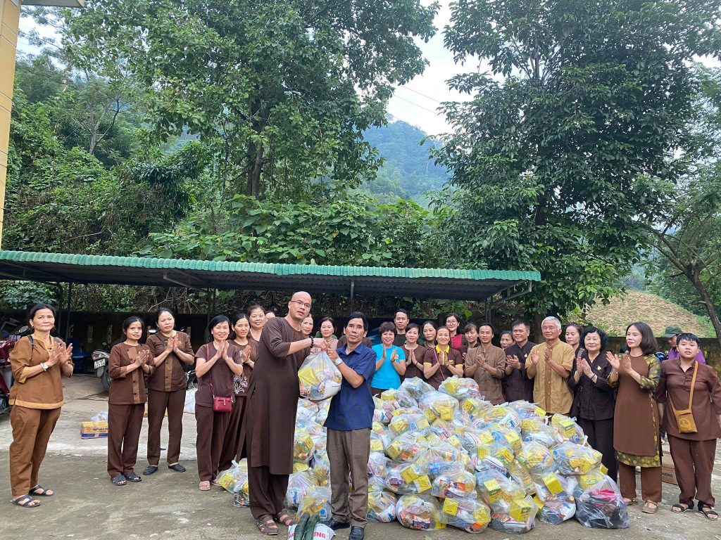 ĐĐ. Thích Quảng Hiếu và Phật tử đaọ tràng chùa Tân Hải tặng quà cho bà con vùng lũ