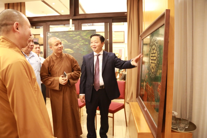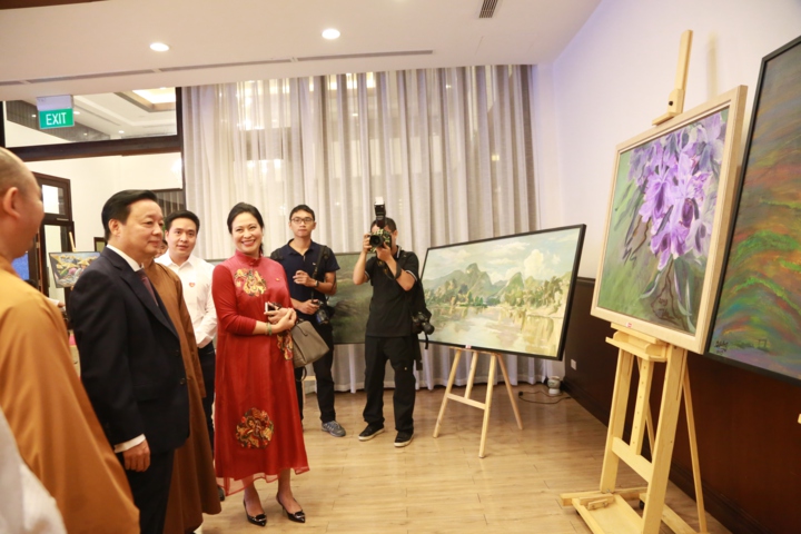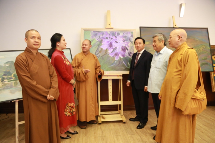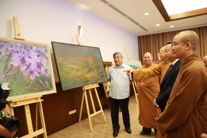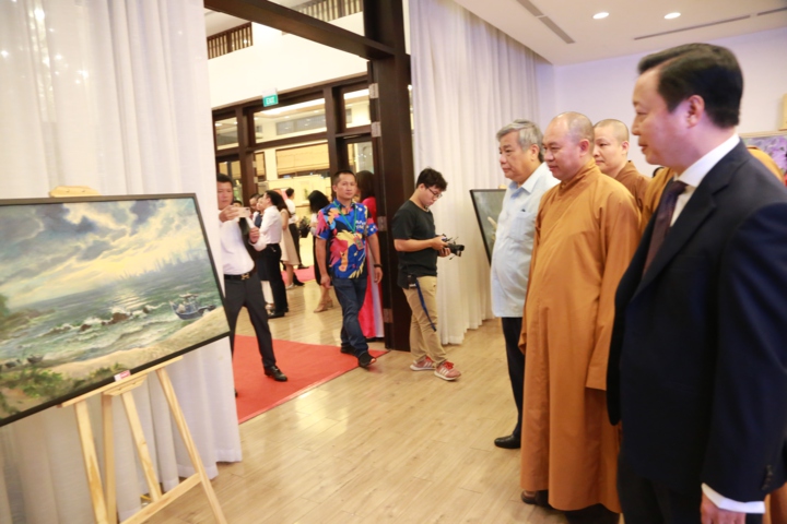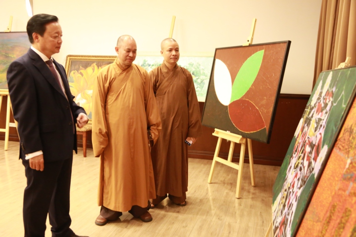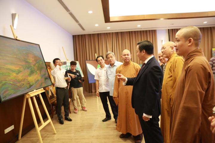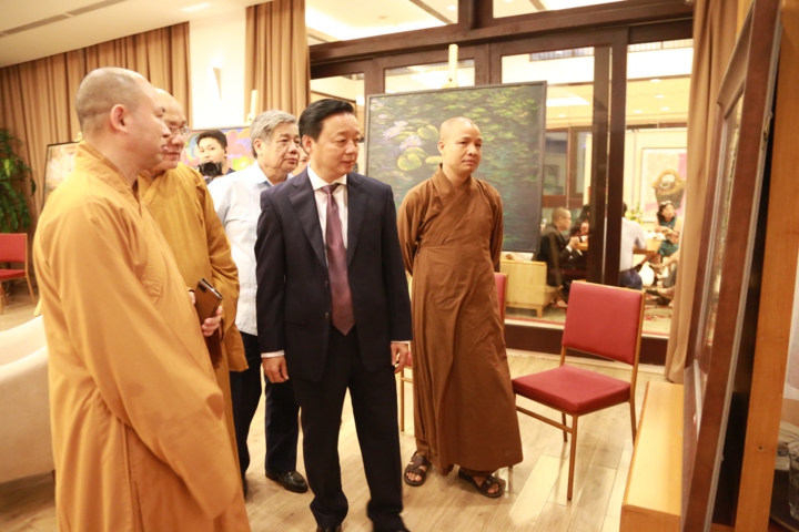 Chư tôn đức và quý quan khách tham quan, thưởng lãm tranh của các họa sĩ được treo trong buổi tối nay
