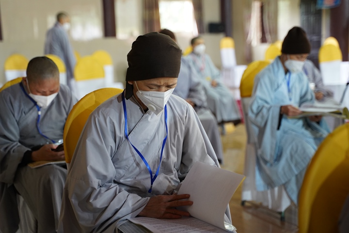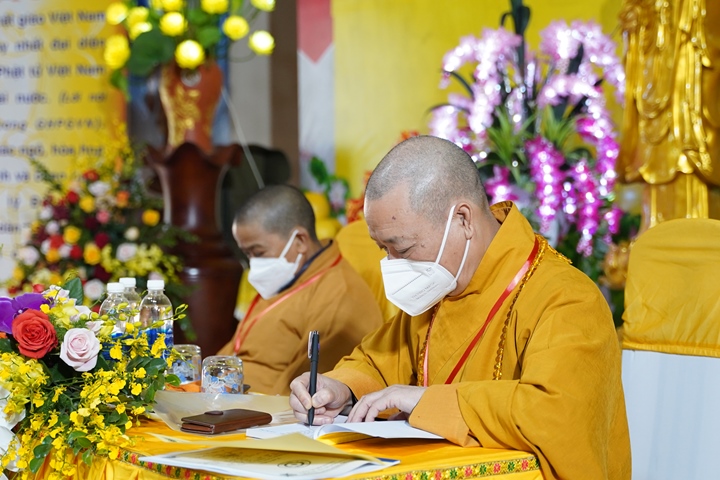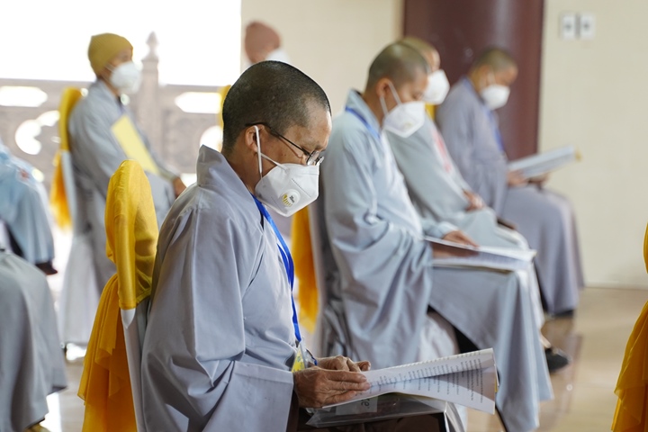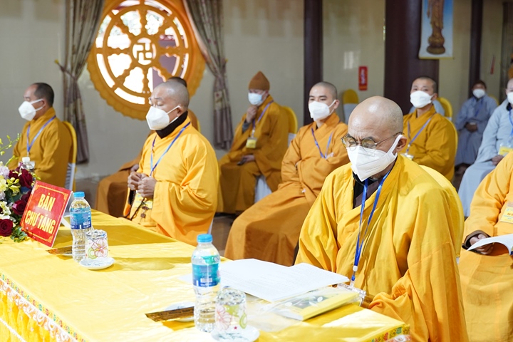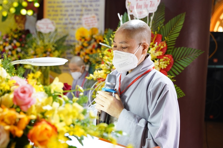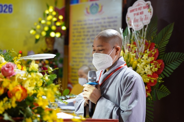 Sư cô Thích Đàm Vượng đọc báo cáo tổng kết công tác Phật sự nhiệm kỳ 2016 - 2021 và phương hướng hoạt động Phật sự nhiệm kỳ 2021 - 2026