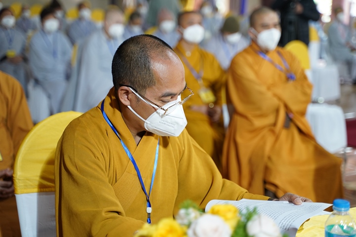 Sư cô Thích Đàm Vượng thay mặt Đoàn thư ký đọc dự thảo Nghị quyết Đại hội
