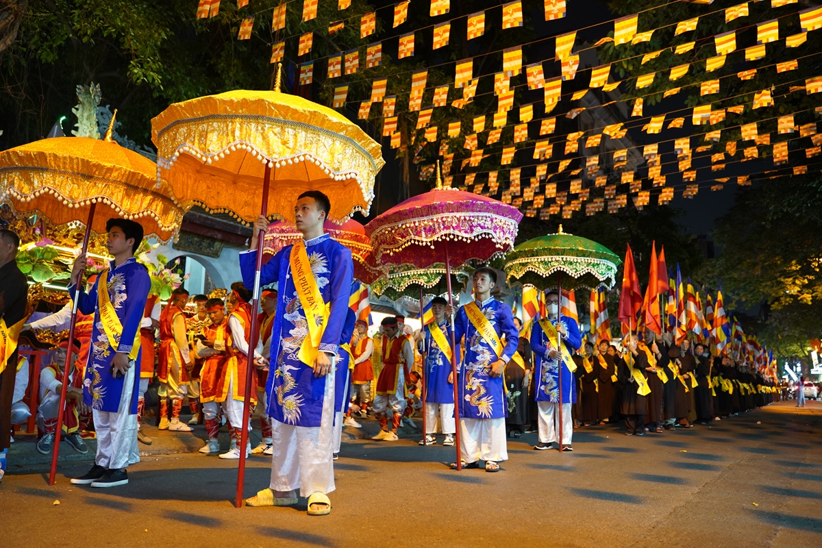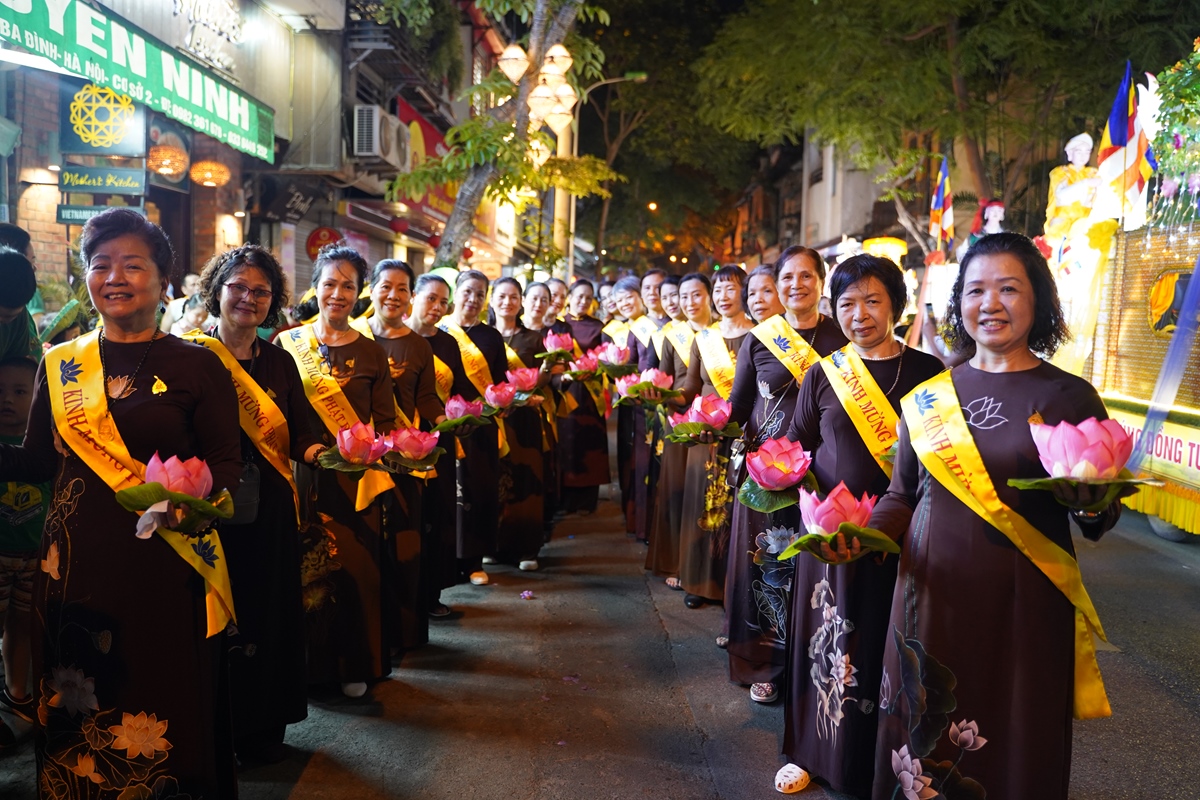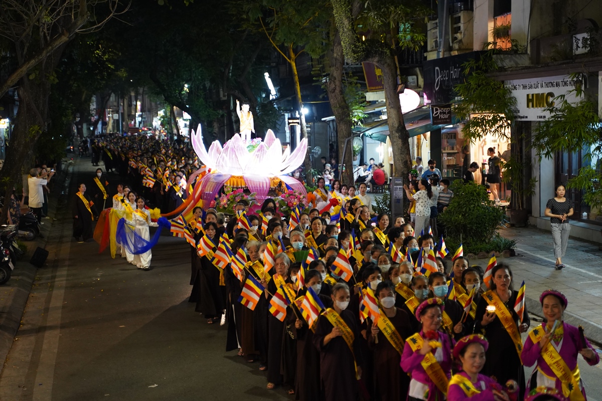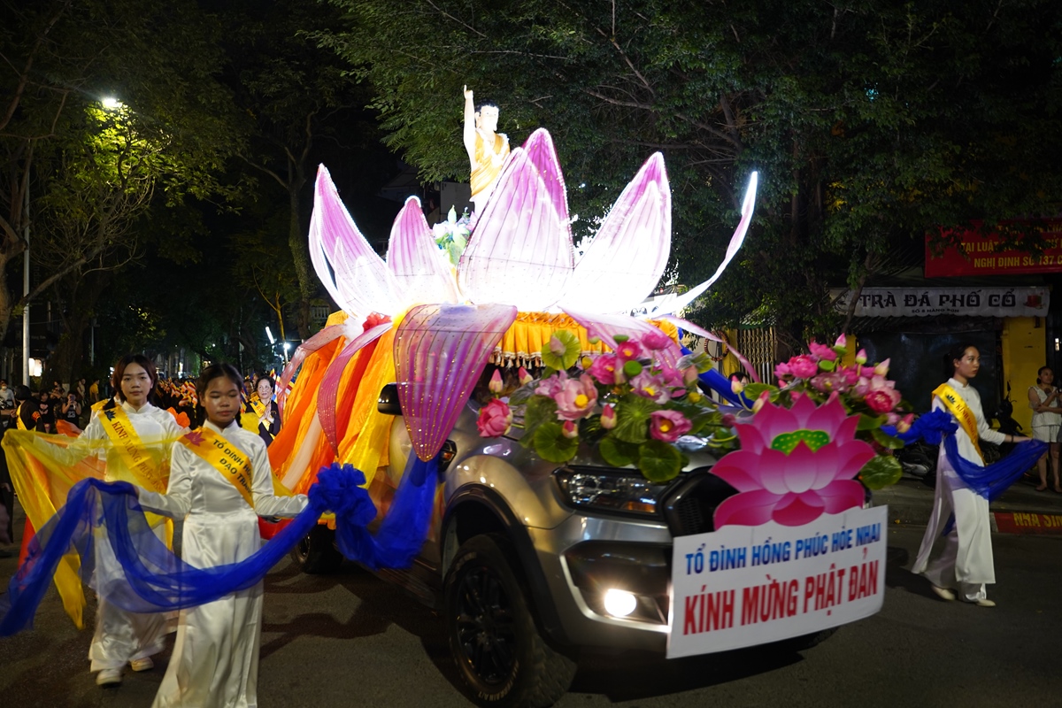 Tại những con phố mà đoàn rước Phật đi qua, ánh sáng từ những xe hoa, kiệu Phật, hay từ chính những chiếc đèn bông sen trên tay mỗi Phật tử, hòa cùng tiếng niệm hồng danh Đức Bản Sư Thích Ca Mâu Ni Phật đã tạo nên một không gian lắng đọng, an yên trong lòng mỗi người con Phật tử.