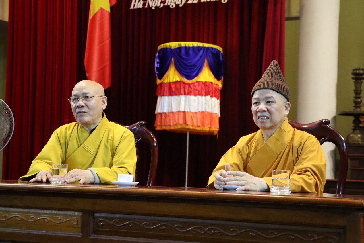 Đại diện cho phái đoàn, Hòa thượng Thích Quảng Tùng đã gửi lời vấn an sức khoẻ đến quý chư Tôn đức lãnh đạo Hội đồng Điều hành, quý thầy cô Văn phòng cùng Tăng Ni sinh đang theo học tại Học viện.