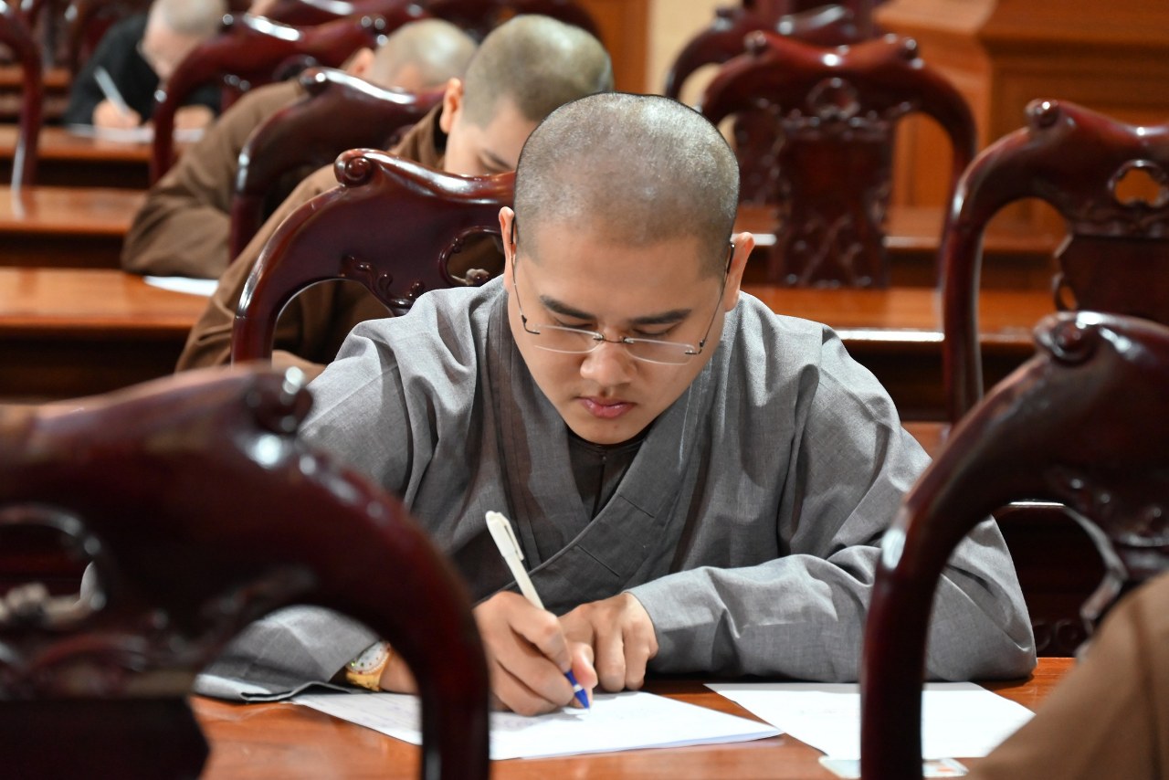 Tiếp đó, Hoà thượng Viện trưởng đã giới thiệu khái quát về chủ trương đào tạo hệ Sau Đại học của Học viện với mục đích trang bị kiến thức Phật học chuyên sâu và phương pháp nghiên cứu khoa học để người học có thể tiếp cận kinh điển một cách rành mạch; đề cao tính nghiêm túc, thực học, thực tu của mỗi Học viên trong quá trình theo Học tại Học viện. Hoà thượng đặc biệt đánh giá cao tinh thần ham học, ham tu của các Học viên cư sĩ, không chỉ học tập kiến thức Phật học mà còn là tấm gương cho con cháu. Hoà thượng Viện trưởng, Hoà thượng Thích Thanh Đạt và Giáo sư Lương Gia Tĩnh đã động viên các thí sinh bình tĩnh, tự tin, trung thực, nghiêm túc trong quá trình làm bài thi.