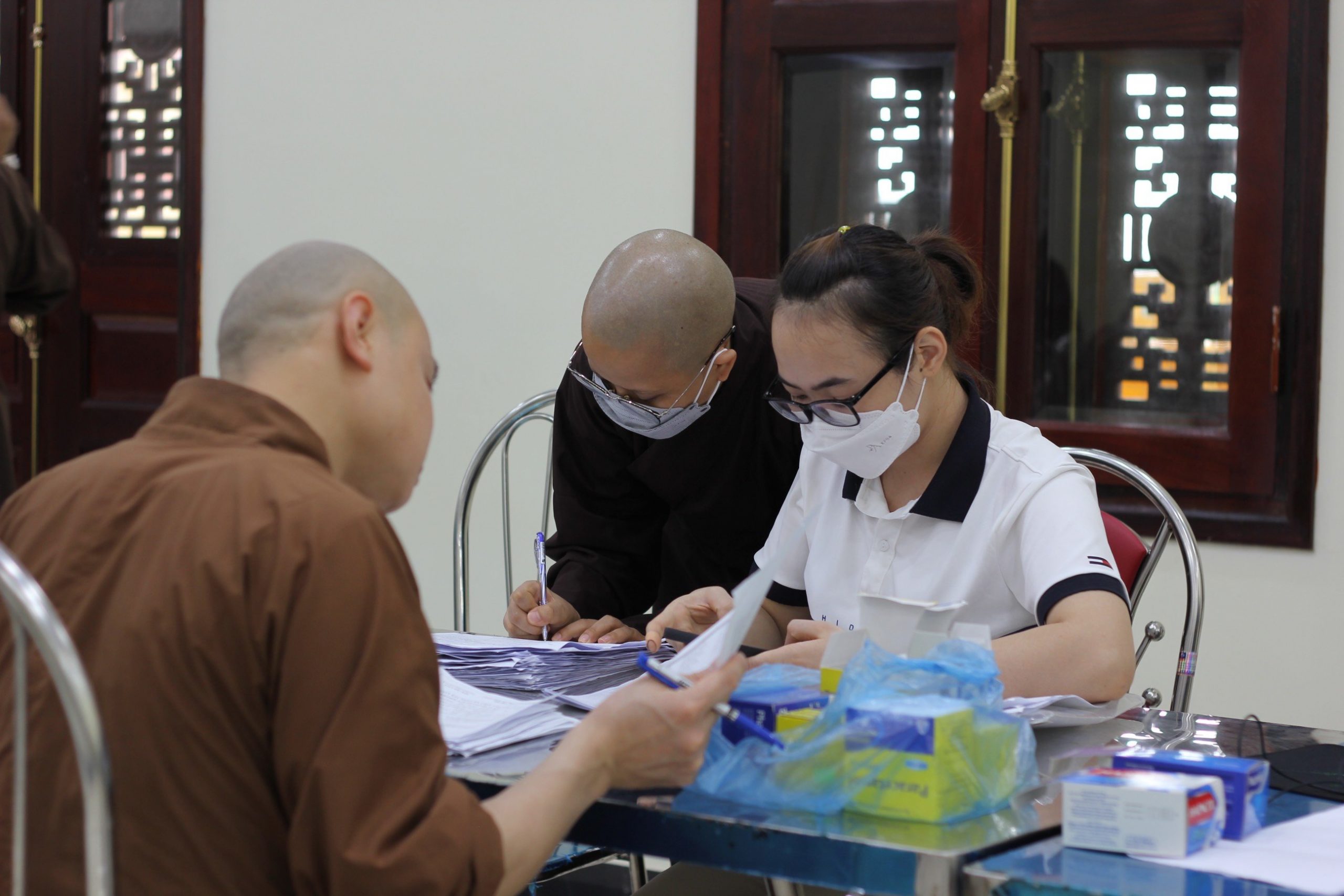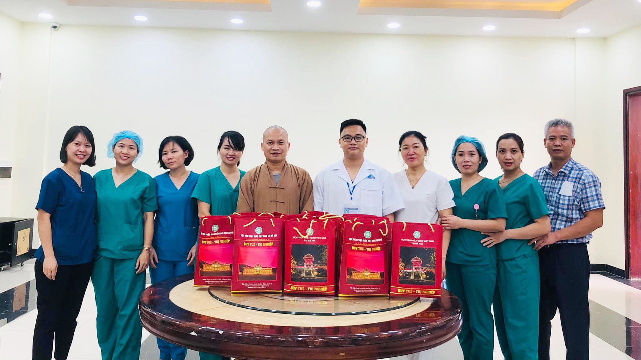 Cuối buổi tiêm, Đại đức Chánh Văn phòng đã thay mặt chư Tôn đức Hội đồng Điều hành và Tăng Ni sinh gửi đến món quà lưu niệm và lời cảm ơn chân thành đến các cán bộ Trung tâm Y tế huyện Sóc Sơn, Hà Nội.