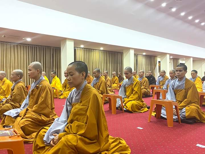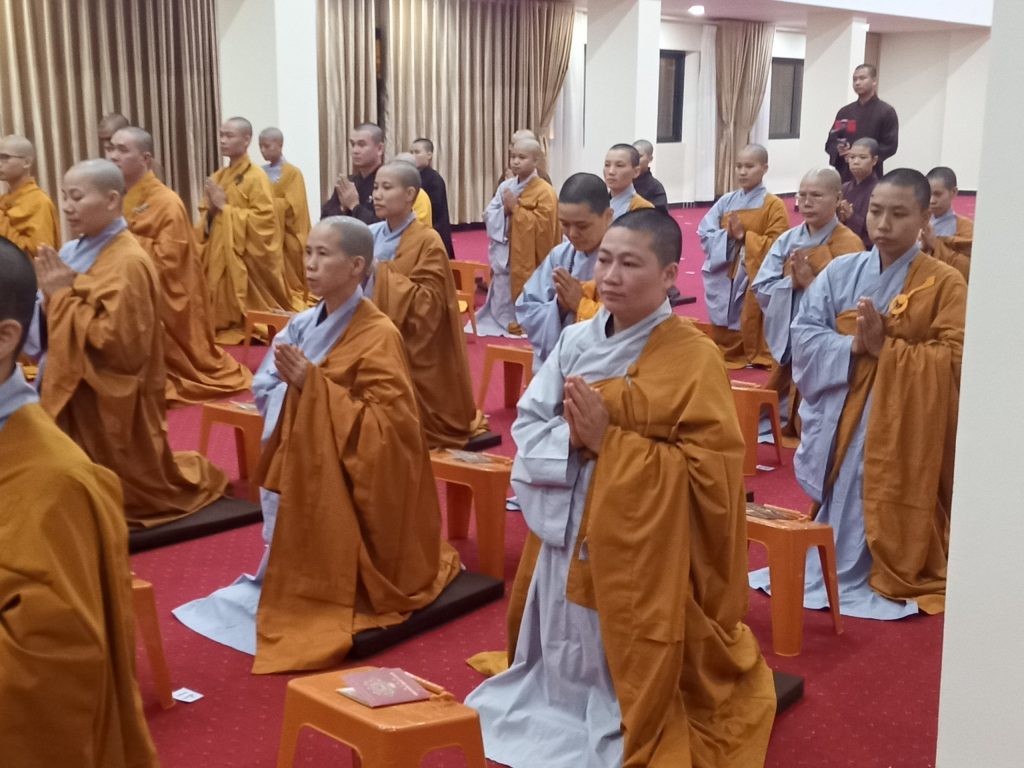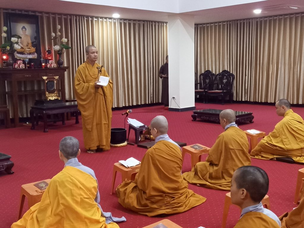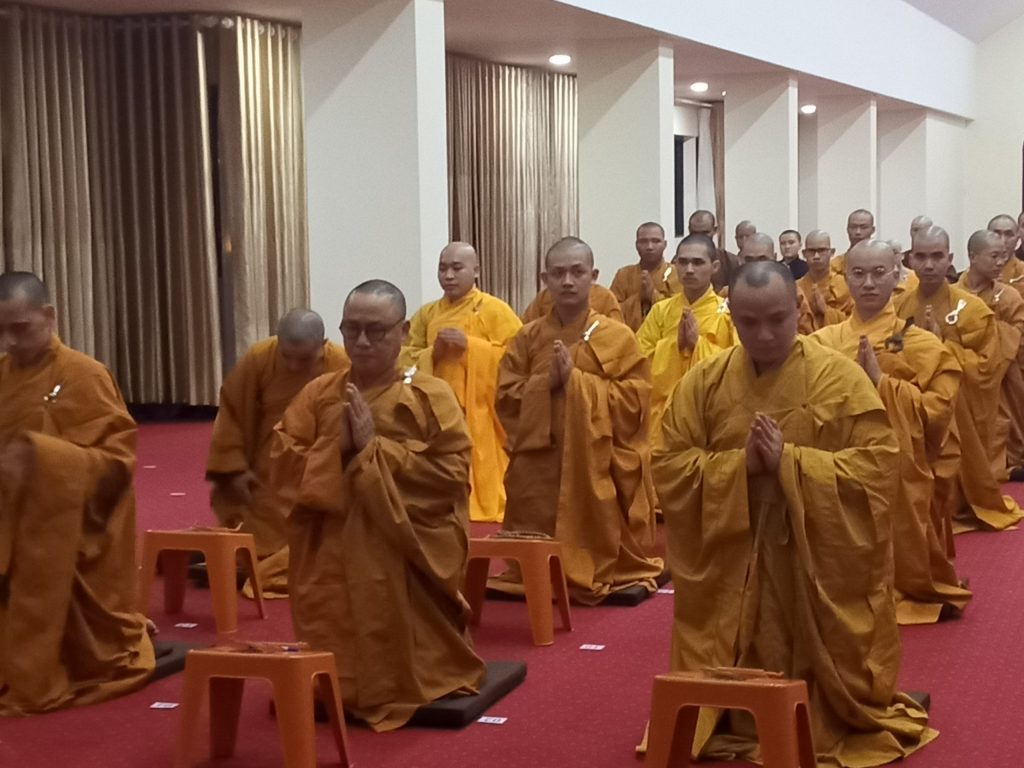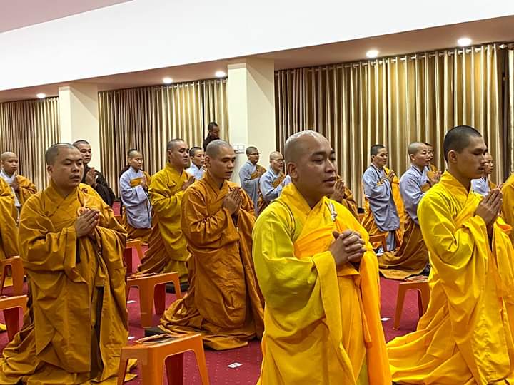 Tiếp theo, Thượng tọa cùng quý vị Tăng Ni sinh chính thức cử hành buổi lễ tụng niệm cầu “Quốc thái dân an, thế giới hòa bình, Phật nhật Tăng huy, Pháp luân thường chuyển, mưa thuận gió hòa, nhà nhà ấm no hạnh phúc, bệnh tật tiêu trừ, hồi hướng cầu nguyện cho anh linh Chủ tịch Hồ Chí Minh, anh linh anh hùng Liệt sĩ,… những người đã hi sinh cho sự độc lập tự do của dân tộc Việt Nam, các nạn nhân tử vong do dịch bệnh Covid-19 trên toàn thế giới được siêu sinh tịnh độ, đi về cảnh giới an lành.”