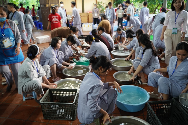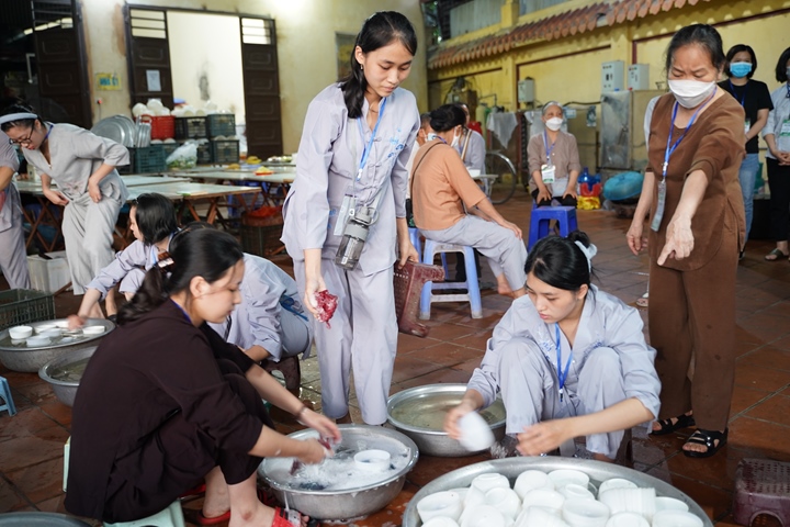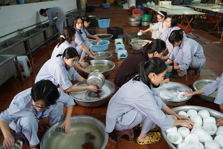 Buổi tối, sau khi dùng bữa xong, các Chúng đã "phân công" rửa bát các ngày trong khóa tu. Ai nấy đều rất hân hoan khi được giúp đỡ các bà các bác trong Ban hậu cần, đồng thời trải nghiệm việc lao động theo đội nhóm này.