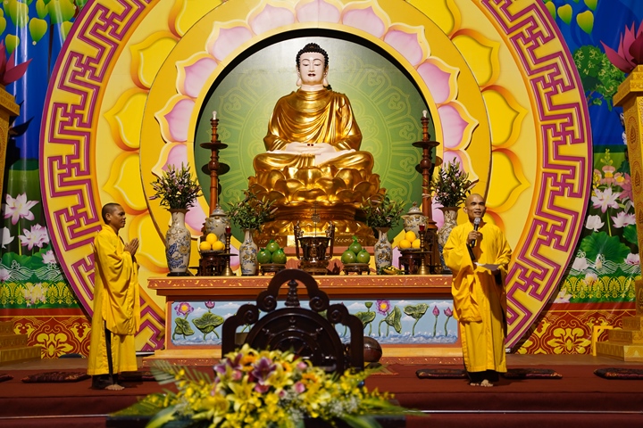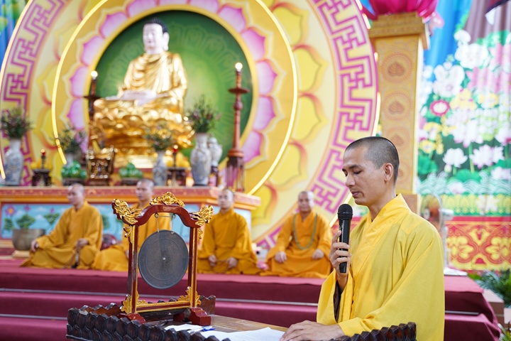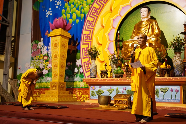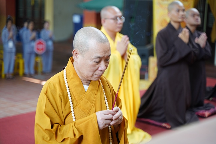 Đúng 8h00 sáng, ban nghi lễ cung rước chư tôn đức chứng minh quang lâm lễ đài để niêm hương bạch Phật, cầu nguyện cho khóa tu thành tựu viên mãn.