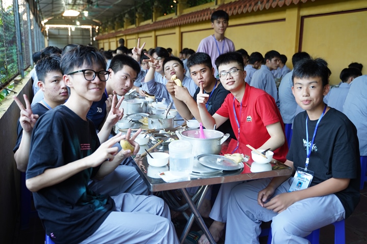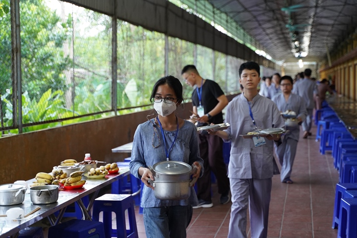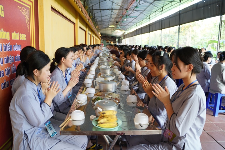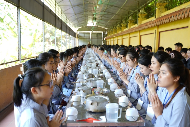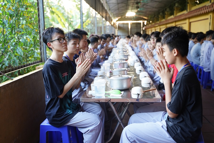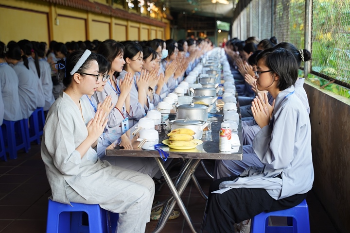 Buổi trưa, quý Thầy đã hướng dẫn các khóa sinh thực tập nghi thức Cúng Ngọ - một nghi thức quan trọng trong bữa trưa của chốn thiền môn. Bữa trưa đầu tiên đã trôi qua nhẹ nhàng, an vui với những món ăn chay thơm ngon, bổ dưỡng.