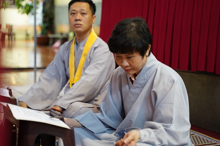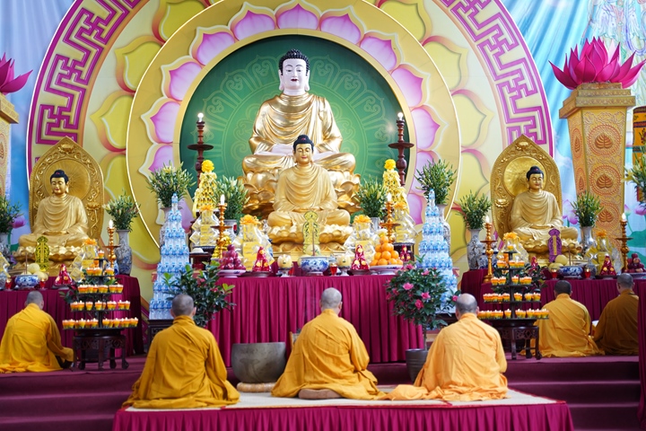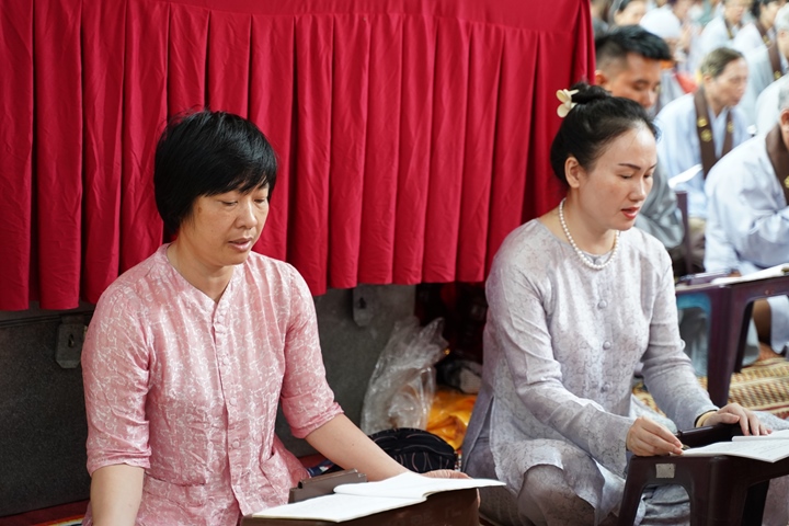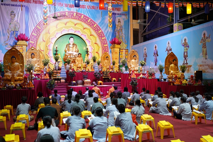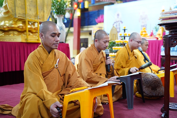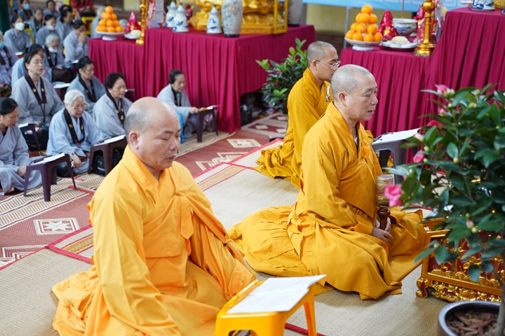 Sau đó, dưới sự chủ lễ của Hòa thượng trụ trì cùng chư Tôn đức Tăng, đại chúng tiếp tục trì tụng kinh Dược Sư trong niềm chí thành chí kính của người con Phật, cầu nguyện thế giới hòa bình, nhân dân an lạc, gia đình hạnh phúc yên vui.