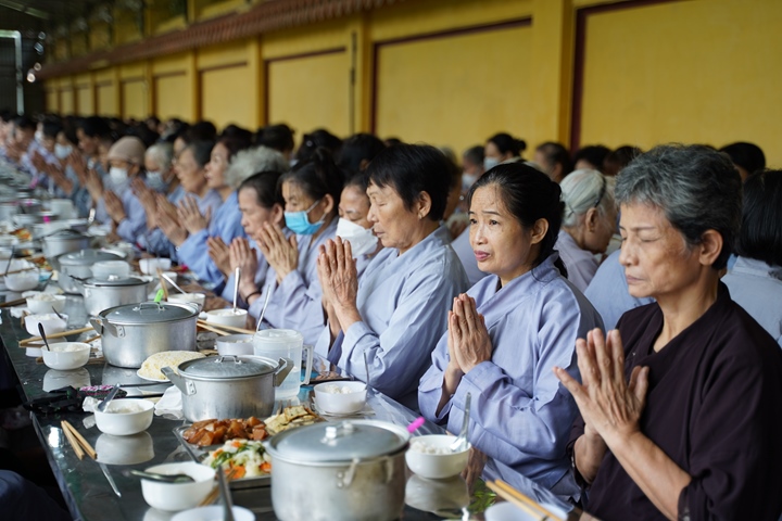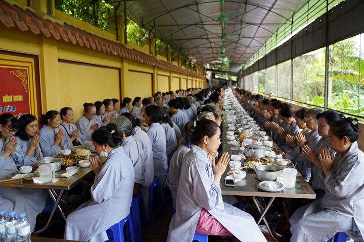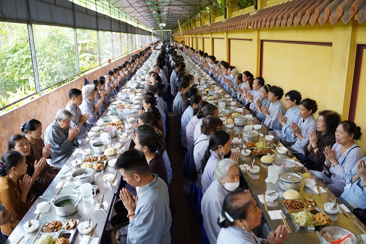 Buổi trưa, đại chúng cùng thực hiện nghi thức Cúng Quá Đường, dùng cơm chay trong chính niệm, an lạc.