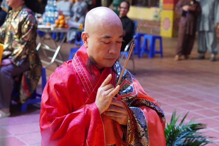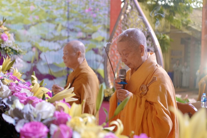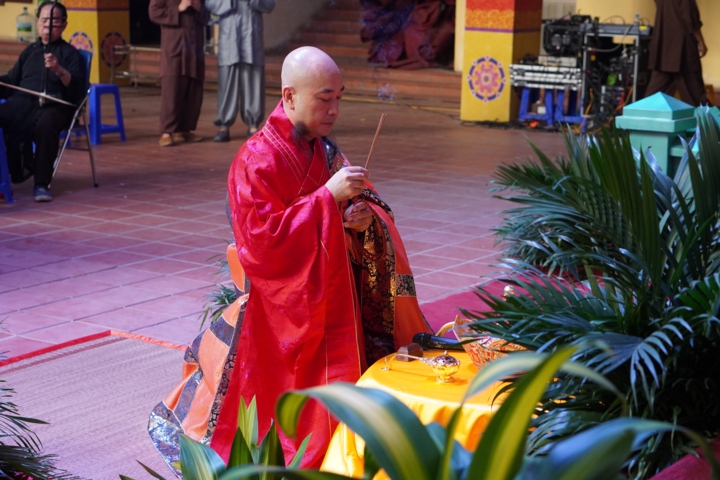 Tiếp theo, Hòa thượng chứng minh cùng chư tôn đức Tăng và Đạo tràng trang nghiêm thực hiện nghi thức dâng hương cúng dàng Tam Bảo.