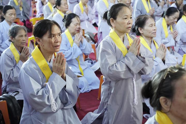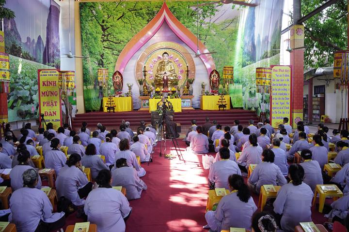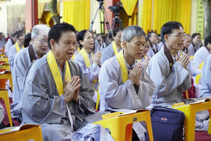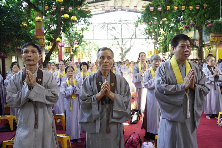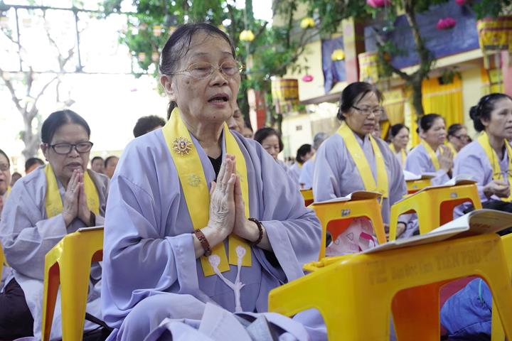 Ngay từ sáng sớm, hàng Phật tử đã vân tập về trước lễ đài, trang nghiêm thành kính tụng thời kinh A Di Đà dưới sự chủ lễ của Đại đức Thích Quảng Kiên cùng chư Tăng bản tự.