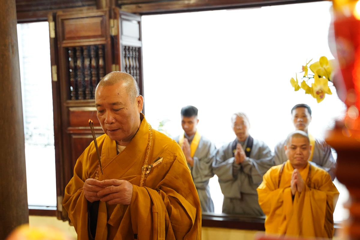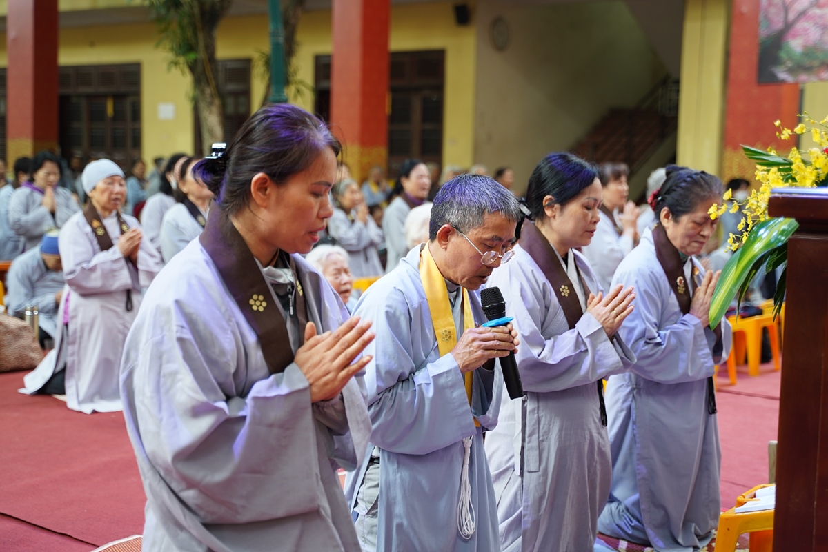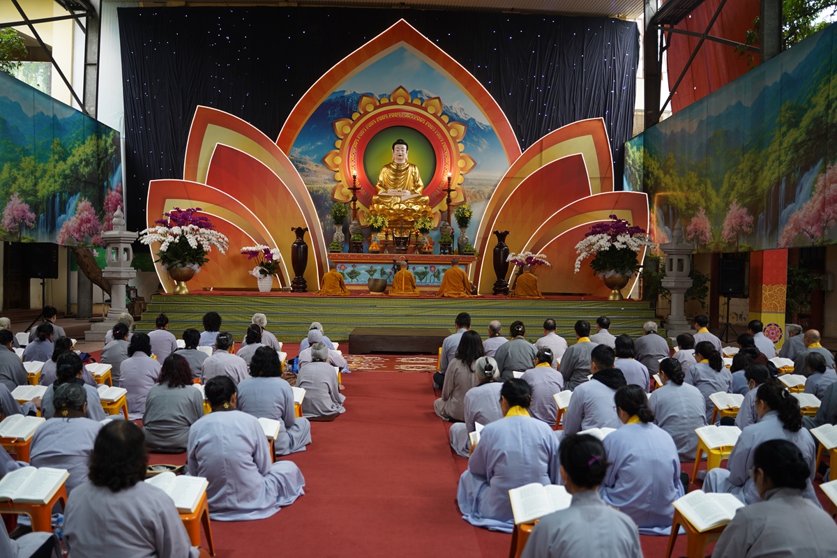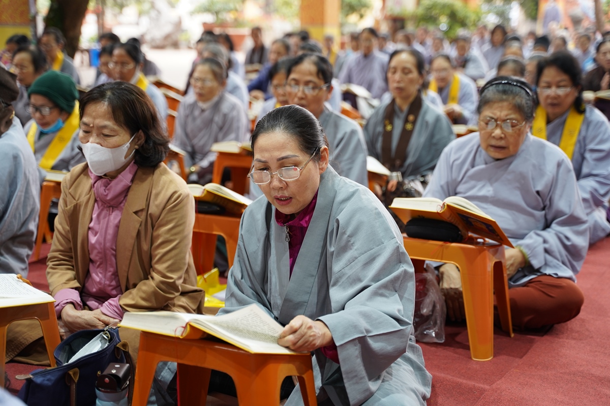 Đầu giờ chiều, dưới sự chủ lễ của Hòa thượng trụ trì cùng chư Tôn đức Tăng bản tự, toàn thể đại chúng đã trang nghiêm thành kính trì tụng Kinh Diệu Pháp Liên Hoa quyển thứ ba, khép lại ngày tu bát quan trai tràn đầy hỷ lạc.