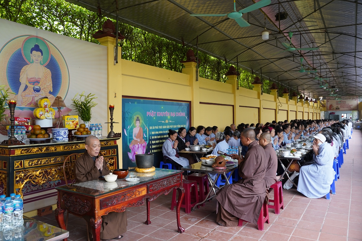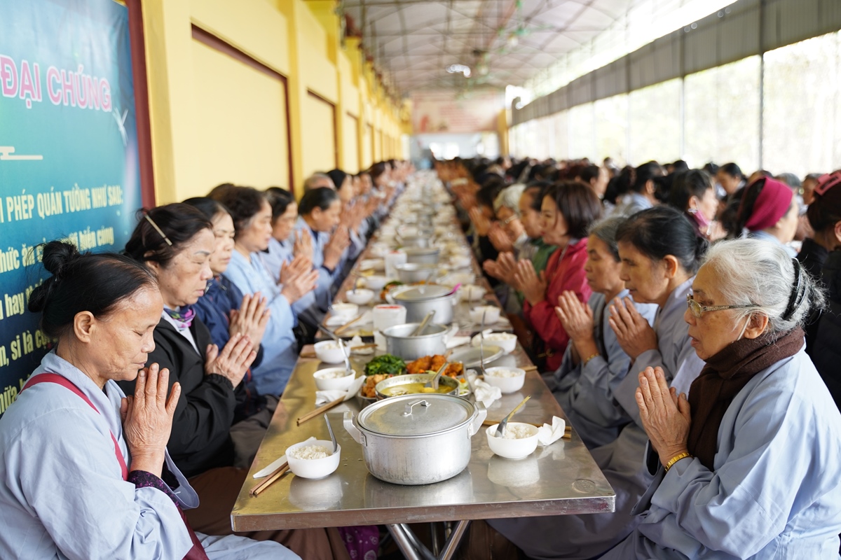Buổi trưa, đại chúng thực hiện nghi thức cúng Quá Đường, dùng cơm chay trong chính niệm, tỉnh thức.