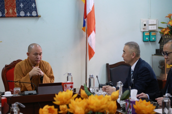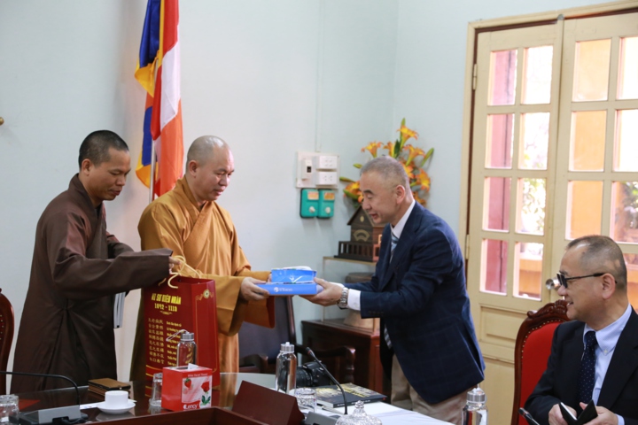 Qua đó các vị trong phái đoàn cũng được hiểu thêm về nền giáo dục Phật giáo Việt Nam, của các Trung tâm giáo dục lớn như: Học viện Phật giáo Việt Nam (PGVN) tại Sóc Sơn – Hà Nội, Học viện PGVN tại Huế, Học viện PGVN tại Hồ Chí Minh và Học viện Phật giáo Nam Tông tại Cần Thơ. Nội dung trao đổi xoay quanh chủ đề các phương pháp thực hành tu tập của các Tông phái, đi sâu vào phương pháp thực hành thiền, chiều sâu về những phương pháp thực hành tu tập, nội dung tu học của Phật giáo Việt Nam; Lịch sử truyền thừa của Phật giáo Việt Nam từ Ấn Độ và Trung Hoa. Qua đó Thượng tọa cũng đã giới thiệu thêm về Trung tâm Luy Lâu là trung tâm tôn giáo cổ xưa của Việt Nam, những bậc cao Tăng trong và ngoài nước cùng với lịch sử hào hùng của Việt Nam. Đại diện đoàn, Giáo sư Minowa Kenryo đã bày tỏ lòng tri ân sâu sắc đến Thượng tọa Thích Đức Thiện và Thượng tọa Thích Thanh Huân cùng chư Tôn đức, đã đón tiếp trọng thị. Ông cùng phái đoàn bày tỏ mong muốn được chư Tôn đức chiếu cố để trong thời gian tới có thể đến Việt Nam nhiều hơn nhằm giao lưu học hỏi nền văn hóa, trao đổi kinh nghiệm nghiên cứu của các phương pháp tu tập. Cuối buổi gặp mặt, chư Tôn đức cùng các vị trong phái đoàn đã trao tặng quà và chụp ảnh lưu niệm trong tinh thần đại hoan hỷ.