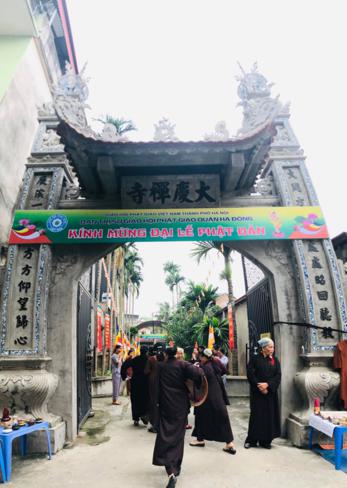 Kết thúc buổi lễ, chư tôn đức Tăng Ni cùng toàn thể Phật tử đã đi nhiễu vòng quanh các xe hoa mừng Phật đản của Phật giáo quận Hà Đông, cùng cầu nguyện quốc thái dân an, đặc biệt cầu mong Đại lễ Vesak Liên Hợp Quốc 2019 sắp tới tại chùa Tam Chúc – tỉnh Hà Nam sẽ thành tựu viên mãn.