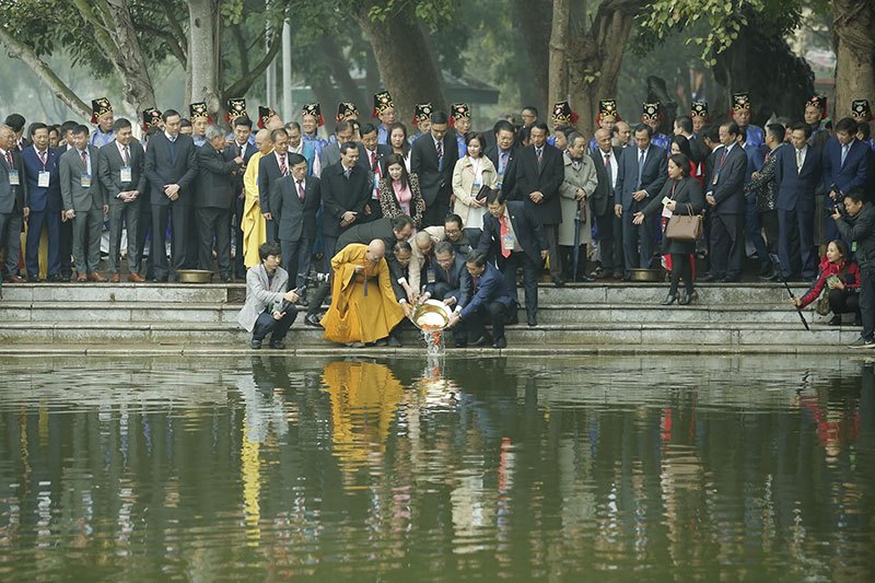 Sau lễ dâng hương, đoàn kiều bào đã thực hiện nghi lễ thả cá phóng sinh tại Hồ Bán Nguyệt của Khu di tích Đền Đô.