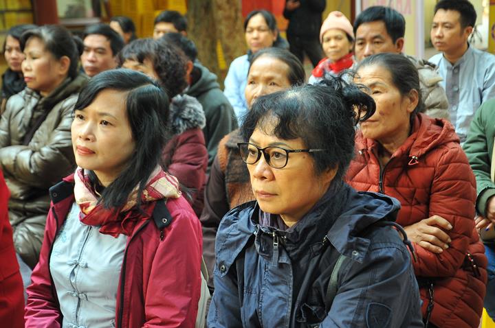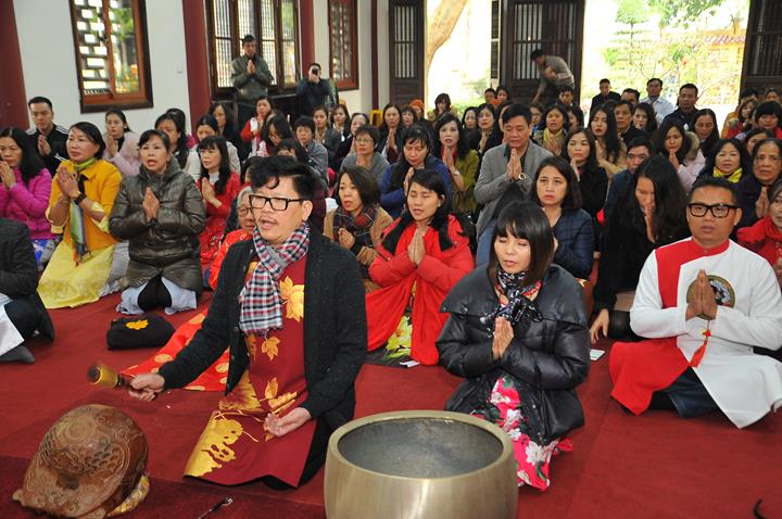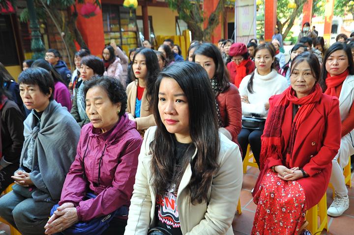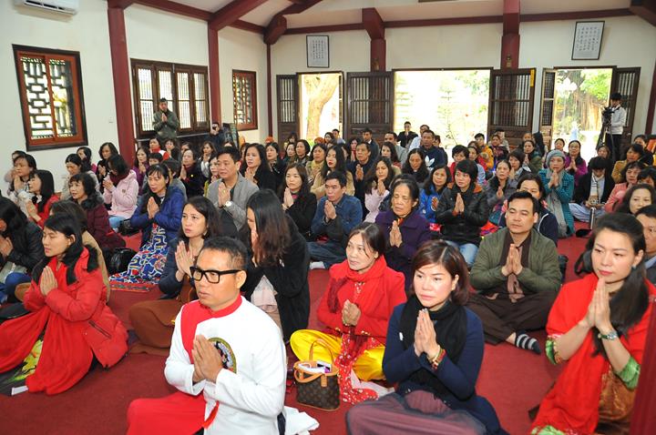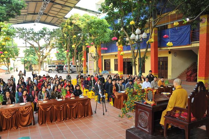 Hòa thượng chia sẻ “Tôi rất vui mừng được đón tiếp các Phật tử là Việt kiều từ châu Âu trở về Đất nước để đón Tết cổ truyền của dân tộc. Việc các Phật tử trở về chùa đầu năm lễ Phật, vãng cảnh và thăm hỏi chư Tăng chính là nét đẹp đầu năm của Phật tử chúng ta, là nét đẹp truyền thống nhất mà Tổ tiên chúng ta đã gây dựng từ bao đời nay và phong tục đó vẫn còn mãi cho đến hiện tại. Quý vị trở về ngôi chùa Bằng – Linh Tiên Tự ở đây là một ngôi chùa cổ, không biết rằng Tổ tiên đã gây dựng ngôi chùa từ năm nào, nhưng hiện nay còn hai tấm bia ghi lại rõ ràng. Đó là tấm bia ghi trùng tu lần thứ nhất do sư Tổ Huệ Tâm – Nguyễn Văn Tông trùng tu năm 1617 và một tấm bia thứ 2 ghi lại trùng tu lớn nhất là năm 1654 dưới thời sư Tổ Huệ Quảng – Lê Khả Đắc. Hai tấm bia đó cũng đủ nói lên bề dày lịch sử của ngôi chùa từ đầu thế kỷ XVII cho tới ngày hôm nay. Trong các khoa bảng, văn bia để lại chúng tôi sưu tầm được từ ngài Huệ Tâm – Nguyễn Văn Tông trùng tu từ năm 1617 tới nay thì đã trải qua 13 đời Tổ sư Hòa thượng trụ trì và chúng tôi là đời thứ 14. Ngôi chùa với bề dày lịch sử truyền thống chư Tổ đã tạo nên cho vùng ngoại ô của Thăng Long, một cảnh quan vô cùng uy nghiêm tráng lệ. Thưa quý vị, nối tiếp các bậc tiền bối và phương châm của chúng tôi là Tiền khai sáng – Hậu trùng tu, tức là các bậc tiền bối mở mang thì người sau phải biết tiếp nối công lao của bậc Tiên Tổ, phải biết trùng tu, duy trì, bảo quản. Cho nên năm 2004, với ý nghĩa 350 năm ngày trùng tu (tính từ năm trùng tu lớn nhất được ghi năm 1654), chúng tôi đã dựng bảo tháp lấy tên là tháp Báo Ân do thiền sư Thích Nhất Hạnh sau khi về tổ chức khóa tu tại chùa đã đặt tên. Bảo tháp thờ Đức Bản Sư Thích Ca Mâu Ni 13 tầng theo ý nghĩa của kinh Niết bàn. Phật dạy rằng Phật nhập Niết bàn xây bảo tháp Phật 13 tầng và thờ Đức Phật Bản Sư Thích Ca Mâu Ni là Đức Giáo chủ, tháp có 8 cạnh tượng trưng cho giáo lý Bát chính đạo và đỉnh tháp cao 54,66m, từ mái đao trở xuống cao 45m tượng trưng cho 45 năm thuyết pháp của Đức Thế Tôn Thích Ca Mâu Ni. Chùa Bằng từ năm 2000 trở về đây đã được Hòa thượng Thích Trí Quảng - bậc Tôn sư của đạo tràng Pháp Hoa và cho tới chúng tôi bây giờ đều coi đây là trung tâm Hoằng pháp của Ban Hoằng pháp TƯ phía bắc và là nơi tu tập của các Phật tử, đủ mọi tầng lớp của xã hội”.
