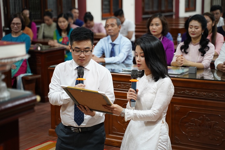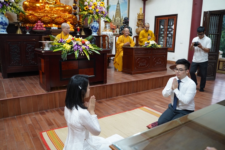 Trước khi cử hành nghi lễ hằng thuận, đôi bạn trẻ đã được Hòa thượng trụ trì và chư Tăng tác pháp quy y Tam Bảo và trao truyền Ngũ Giới để làm kim chỉ nam cho cuộc sống hiện tại. Đôi tân lang tân nương đã được lắng nghe Hòa thượng trụ trì Thích Bảo Nghiêm giảng giải về đạo nghĩa vợ chồng trong kinh Thiện Sinh. Hòa thượng khuyến tấn đôi tân lang, tân nương phải sống trọn vẹn bổn phận làm vợ và làm chồng, làm dâu hiền, rể thảo cùng xây dựng hạnh phúc gia đình.