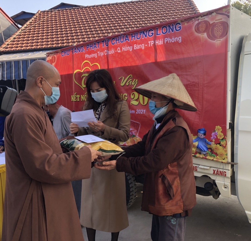 PSO - Ngày 01/02/2020 (nhằm ngày 21 tháng Chạp năm Canh Tý), với tinh thần Từ Bi của người con Phật và nhân dịp chuẩn bị đón tết cổ truyền năm Tân Sửu – 2021, chư Tăng, Phật tử chùa Hưng Long (phường Trại Chuối, quận Hồng Bàng, TP. Hải Phòng) đã tổ chức chương trình “Tết sum vầy kết nối yêu thương”, trao tặng 530 phần quà cho các gia đình có hoàn cảnh khó khăn đang sinh sống trên địa bàn quận Hồng Bàng và bệnh nhân nghèo hiện đang điều trị tại bệnh viện Phổi Hải Phòng, quận Kiến An, TP. Hải Phòng.